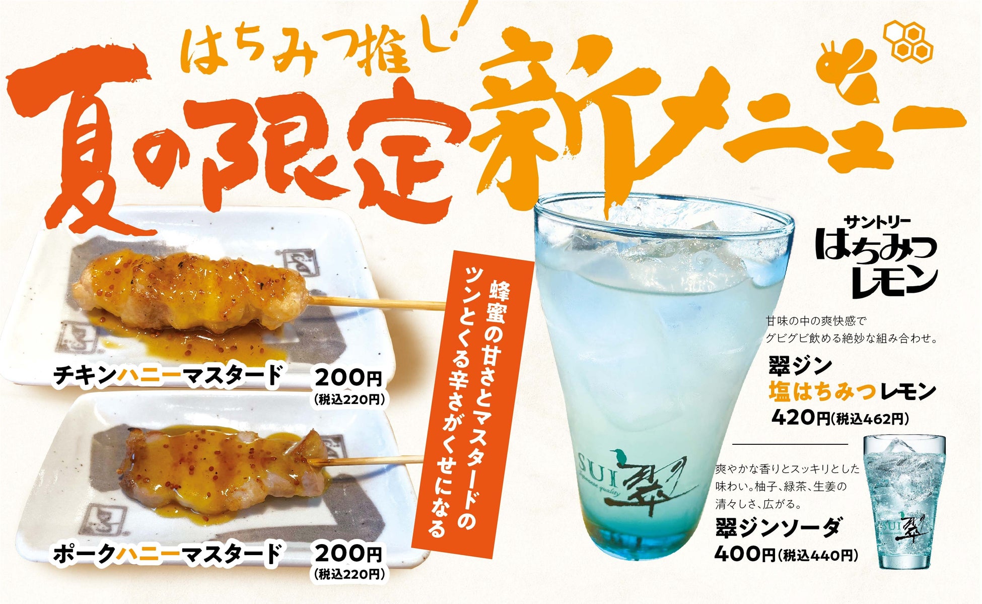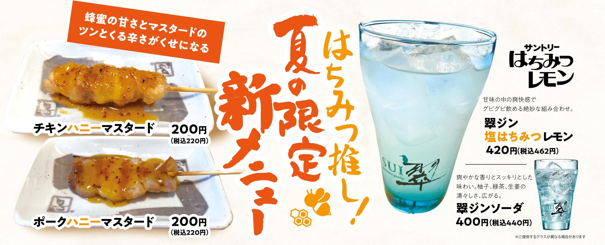 「チキンハニーマスタード」「翠ジン 塩はちみつレモン」など『やきとり大吉』で7/15(月)より夏季限定で販売開始