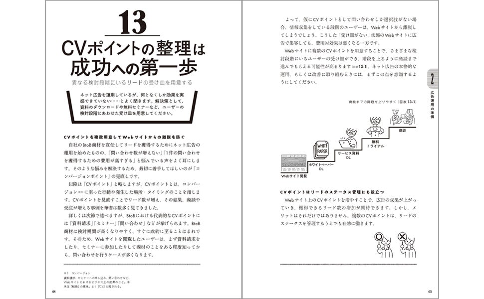 本書では「BtoBマーケティング」について、成果に直結する“打ち手”を具体例とともに紹介した書籍です。SaaSをはじめとした法人向け商材を扱う企業の方や広告代理店の方に向け、主にネット広告を活用して商談や受注を増やし、売上につなげていくための施策を紹介しています。