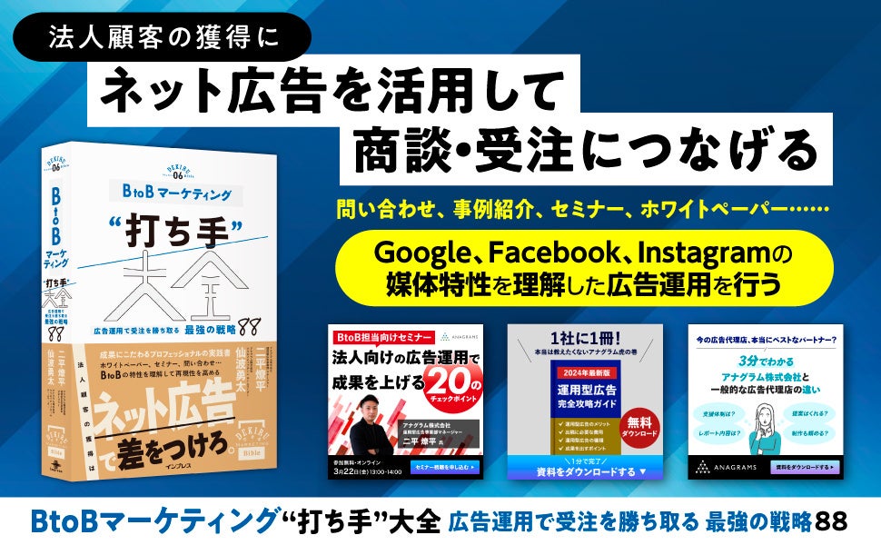 運用型広告に強みを持つマーケティング支援会社(東京都渋谷区、代表取締役:阿部 圭司、以下「アナグラム」)は2024年3月22日(金)に書籍『BtoBマーケティング“打ち手”大全 広告運用で受注を勝ち取る 最強の戦略 88』(出版元:株式会社インプレス)を発売いたします。