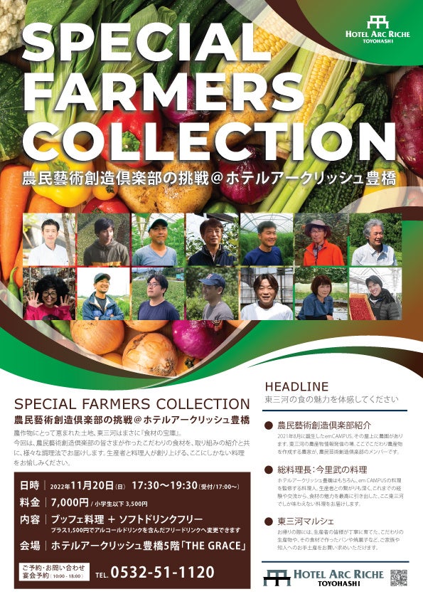 ホテルアークリッシュ豊橋(愛知県豊橋市駅前大通1-55)は、東三河フードバレー構想の実現に向けて、農民藝術創造倶楽部とともに「SPECIAL FARMERS COLLECTION @ホテルアークリッシュ豊橋」を2022年11月20日(日)に開催することといたしましたのでお知らせいたします。