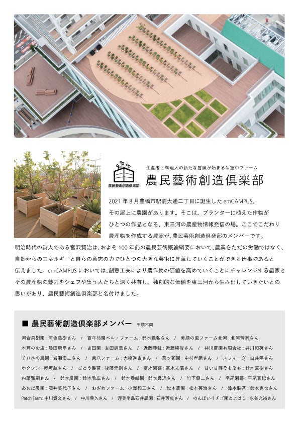 明治時代の詩人である宮沢賢治は、およそ100年前の農民芸術概論綱要において、農業をただの労働ではなく、自然からのエネルギーと自らの意志の力でひとつの大きな芸術に昇華していくことができる仕事であると伝えました。emCAMPUSにおいては、創意工夫により農作物の価値を高めていくことにチャレンジする農家と、その農産物の魅力をシェフや集う人たちと深く共有し、独創的な価値を東三河から生み出していきたいとの思いがあり、農民藝術創造倶楽部と名付けました。