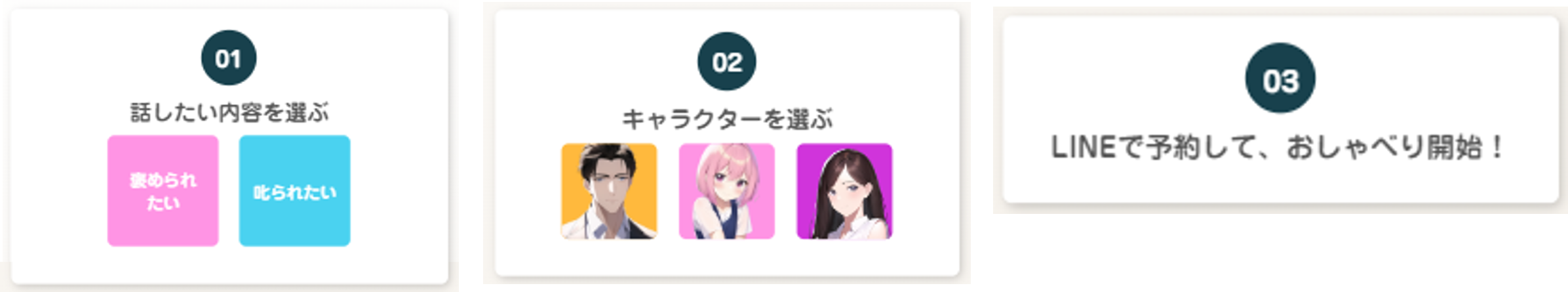 「褒められたい」「叱られたい」「励まされたい」「ぐちを聞いてほしい」の4つの聞いてほしい内容に合わせて、1分200円(税込)で好きなキャラクターと1on1でライブトークをすることができます。