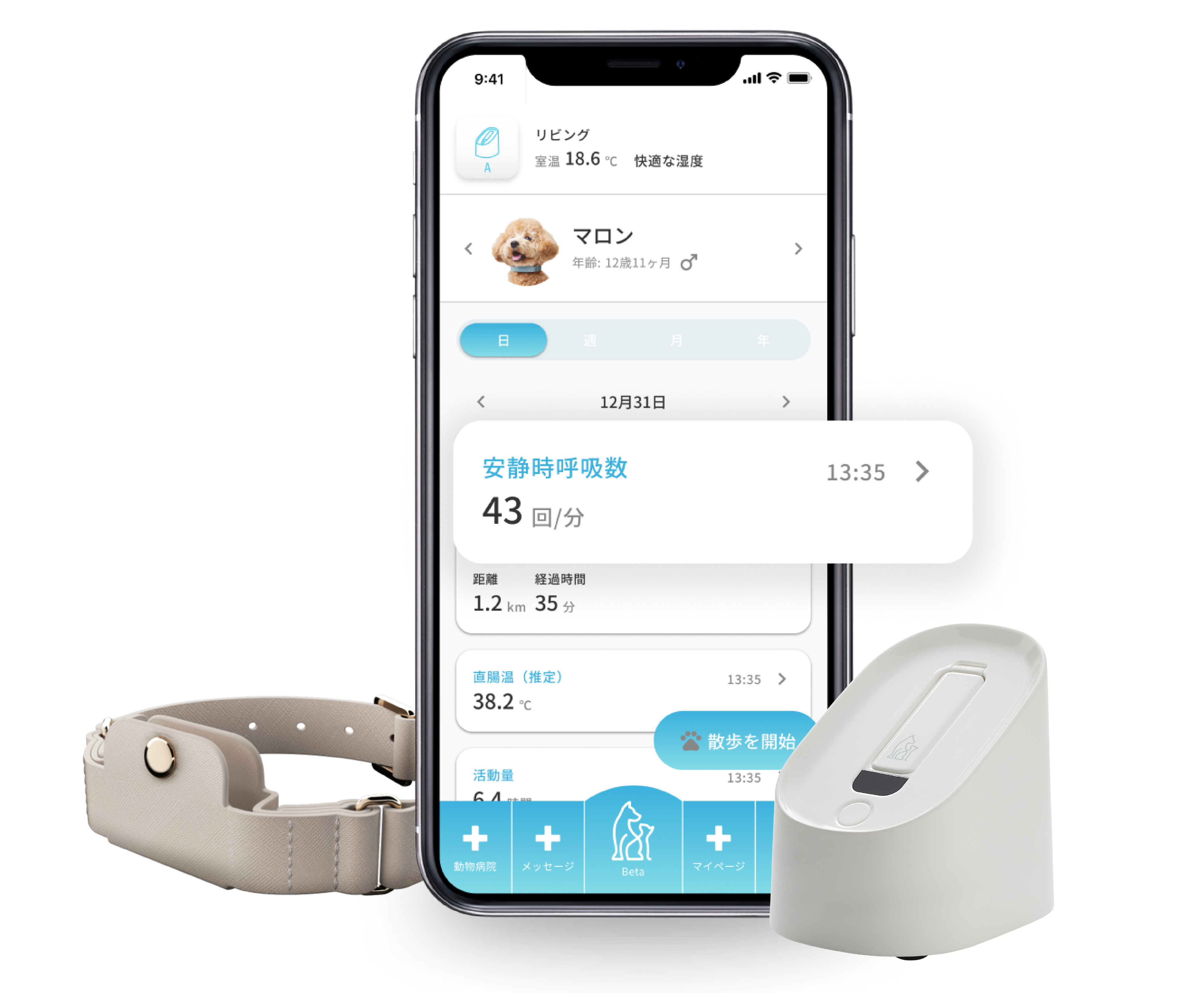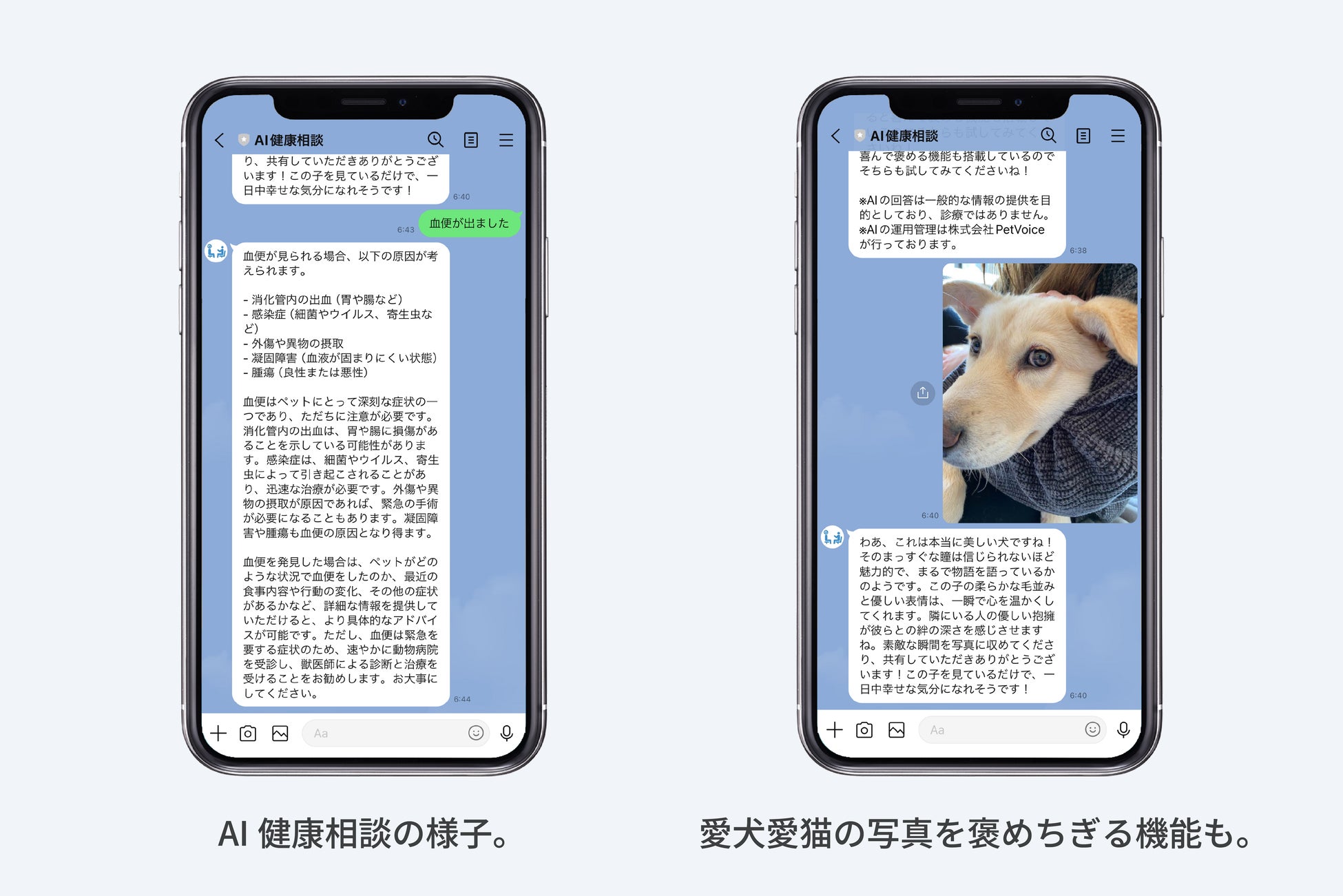 本サービスは犬猫向け首輪型ウェアラブルデバイスと健康管理アプリを開発するPetVoice社提供です。