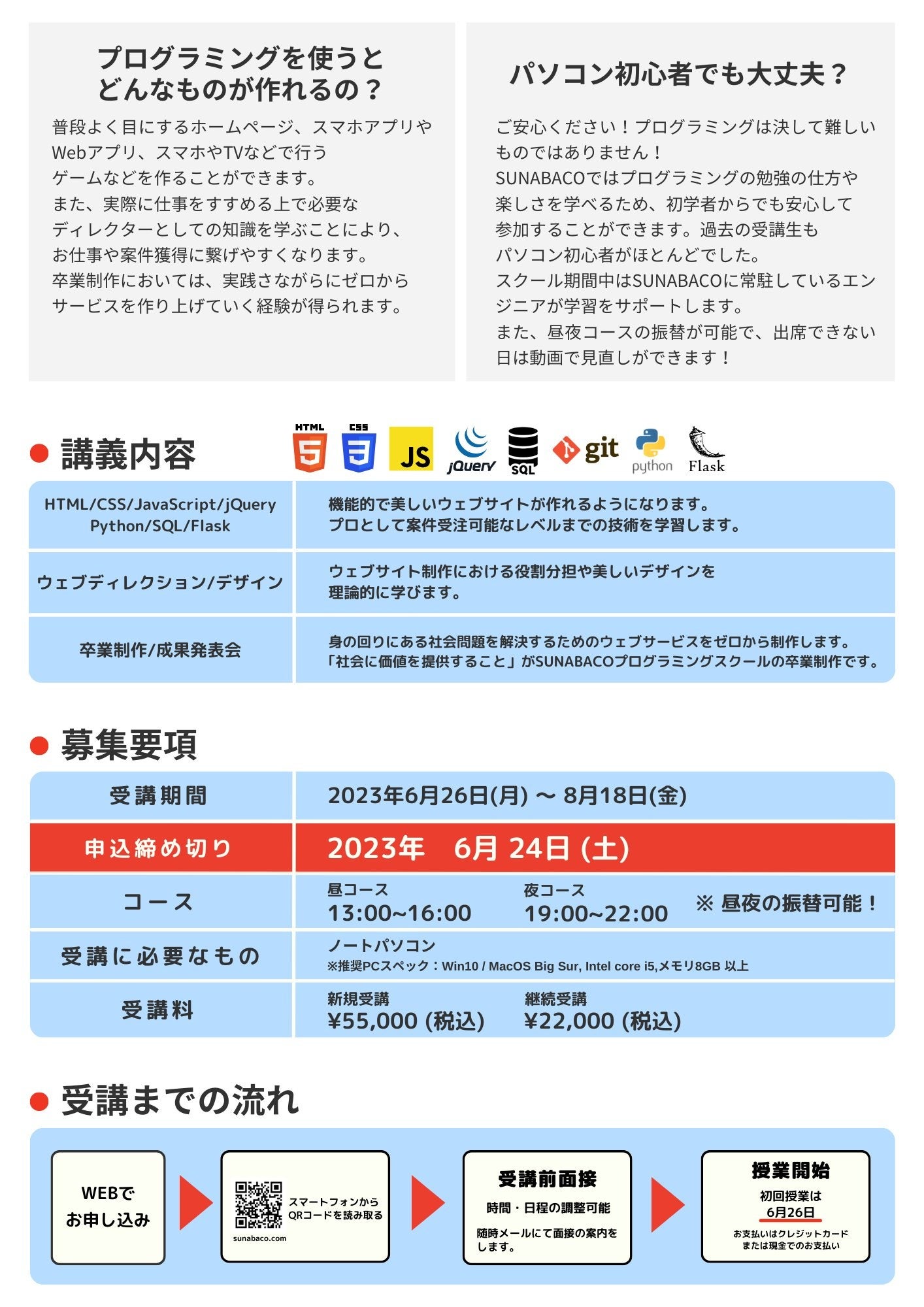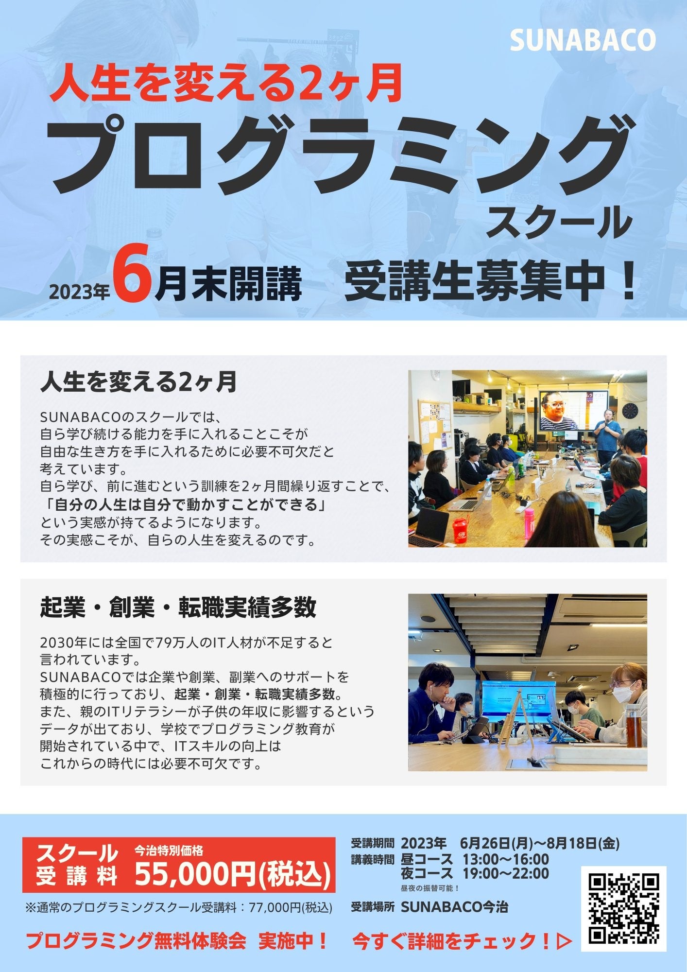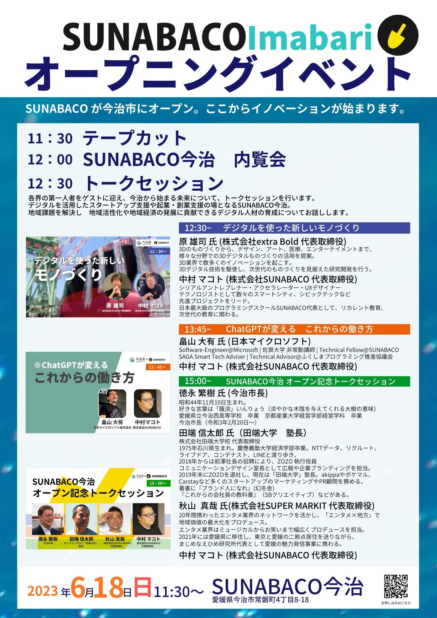 リスキリング、プログラミングなどリカレント教育を提供する株式会社SUNABACOは、全国9ヶ所目の拠点として2023年6月18日に《SUNABACO今治》を今治駅前にオープンします。