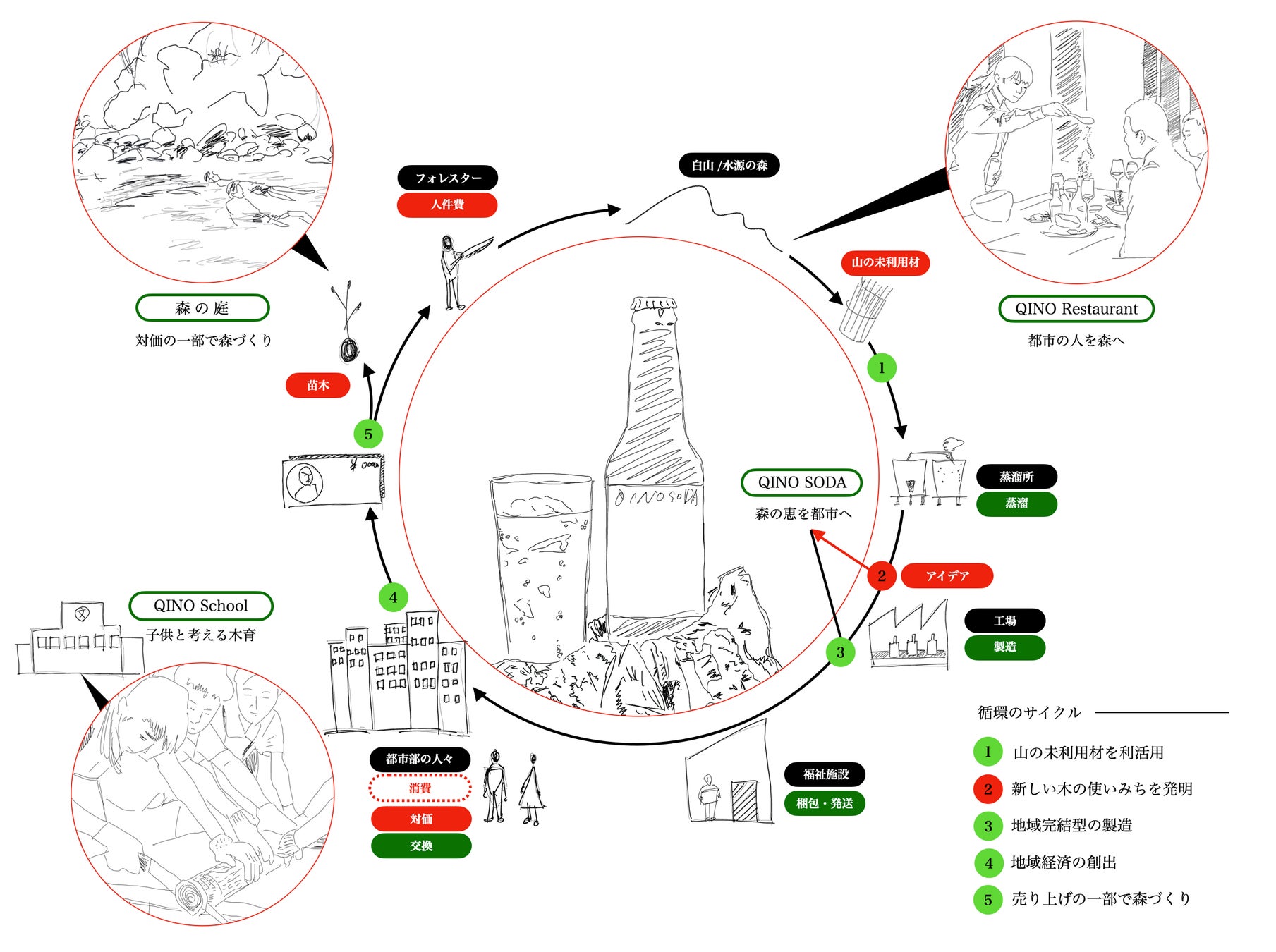 QINOは、水源林を育む林業者や山麓で暮らす人々とともに循環をつくる地域共創プロジェクトです。「木の使いみちに、驚きを。」というスローガンを掲げ、森林環境へのエールになる製品や体験の開発を行っています。世代や性別を問わずどんな方にもお楽しみいただけるよう、飲料ラインナップの拡充に加え、遊びながら森に親しむ「木育」プロダクトの開発にも取り組んでいます。