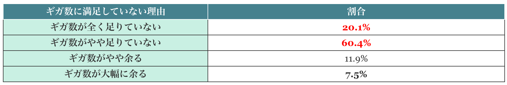 ギガ数に満足していない理由として、「全く足りていない」、「やや足りていない」と回答した人を合わせると80%以上になり、ギガ数が足りないという不満が圧倒的であることが浮き彫りとなりました。