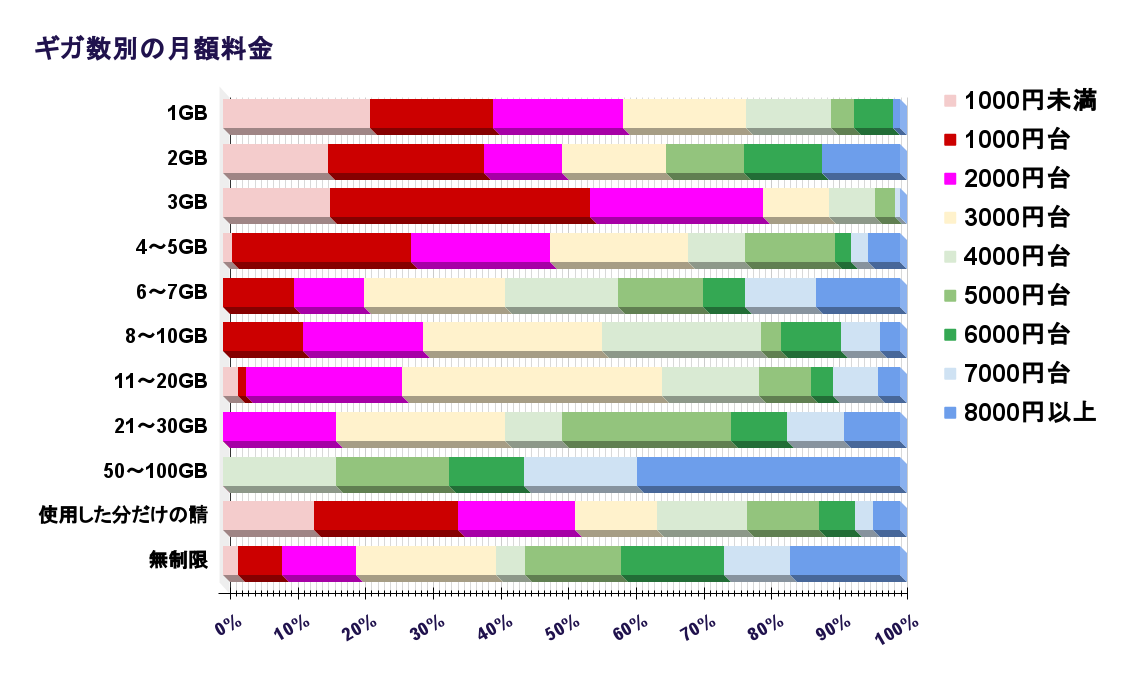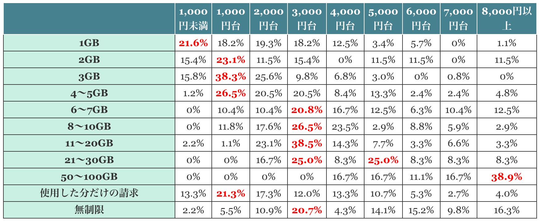 使用した分だけ請求される場合には1,000円台が最も多く、少ないギガ数で事足りる層が多く利用していることが明らかとなりました。