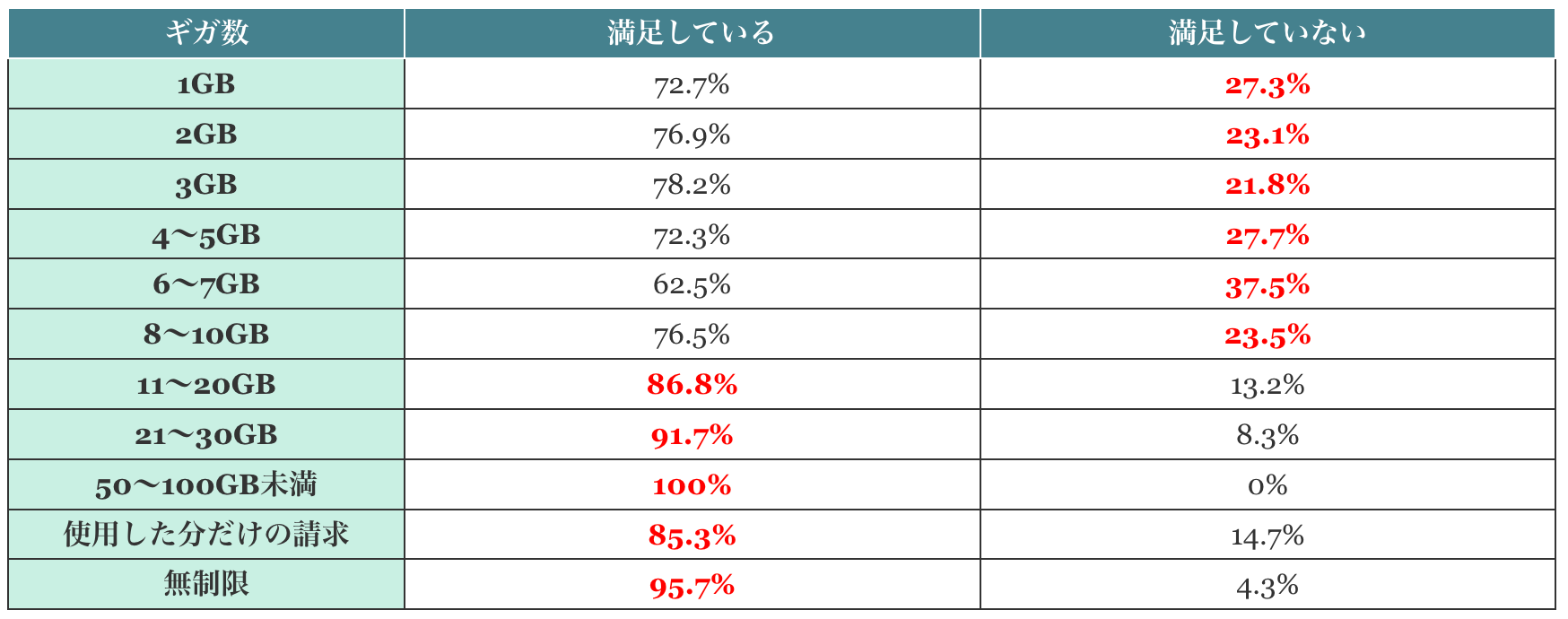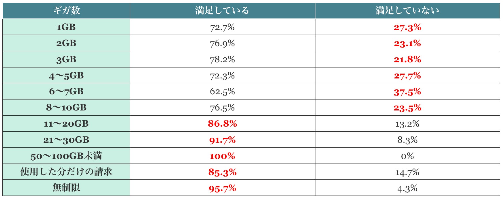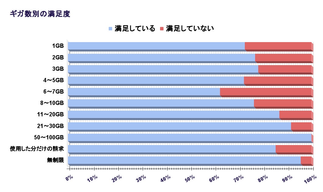 ギガ数別の満足度を見ると、10GBまでは20〜30%前後の人が満足していませんが、それ以上になると90%近くの人が満足していることがわかります。