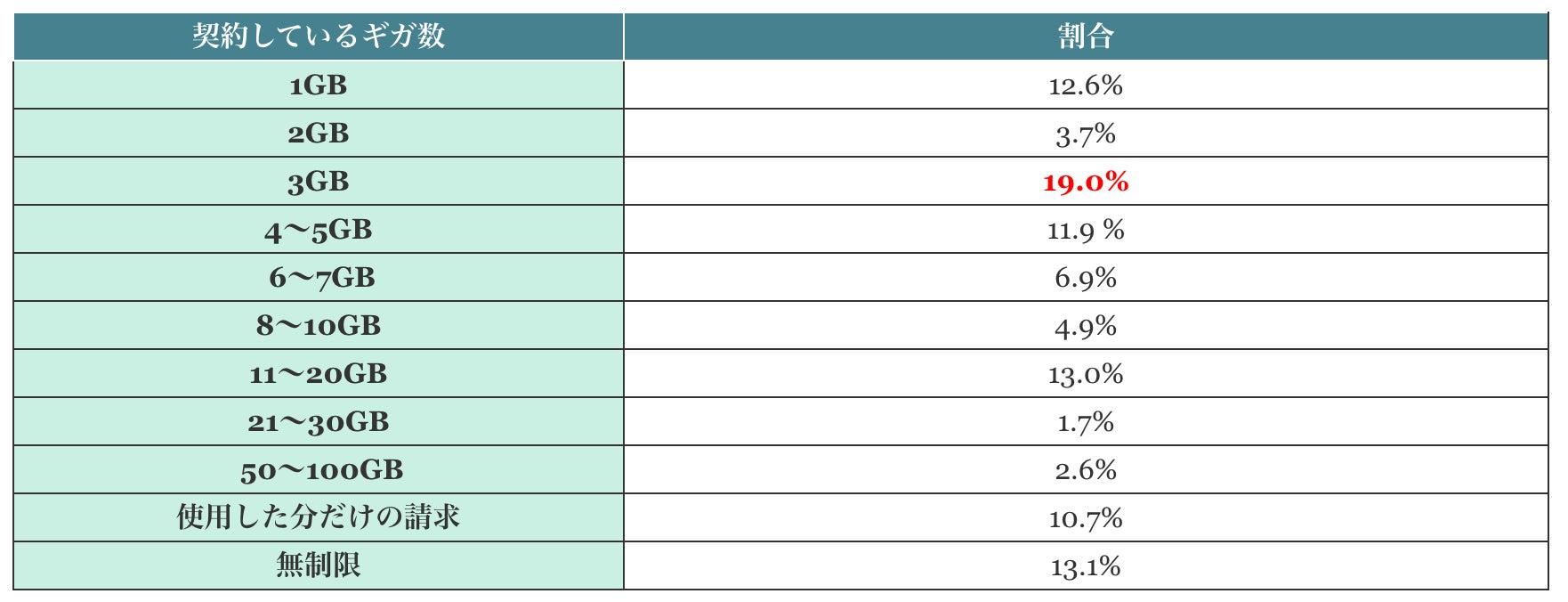 スマホで契約しているギガ数を調査したところ、以下の結果となりました。