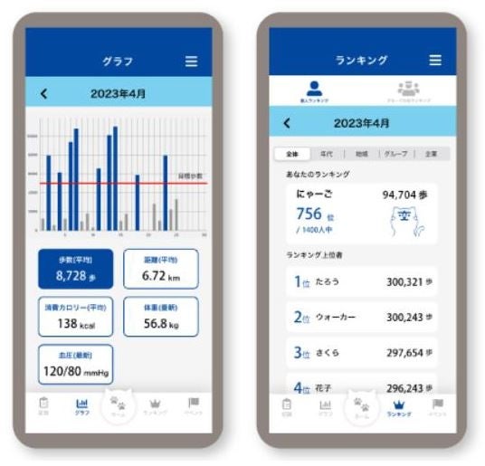 アプリでは日々の歩数が歩数計やグラフで表示されますので、ご自身の日々の生活がどのように健康活動を継続できているか可視化できます。ランキングではご自身を含めたアプリユーザー全体で歩数を比較することができ、健康活動のモチベーションアップに繋げることができます。