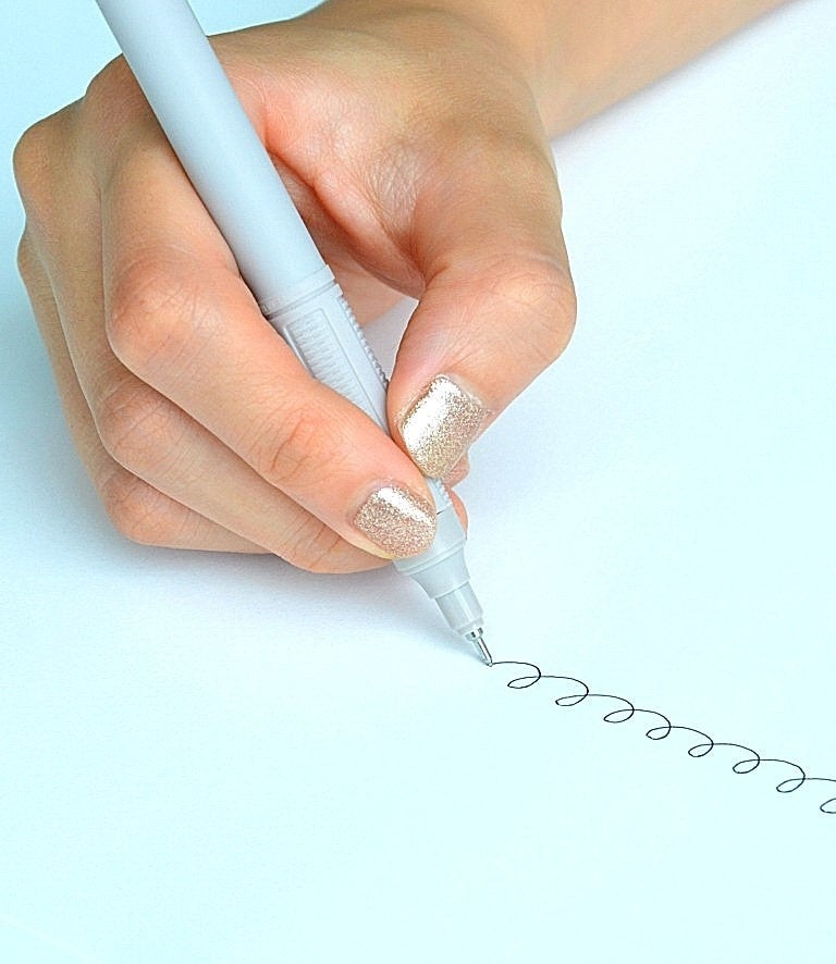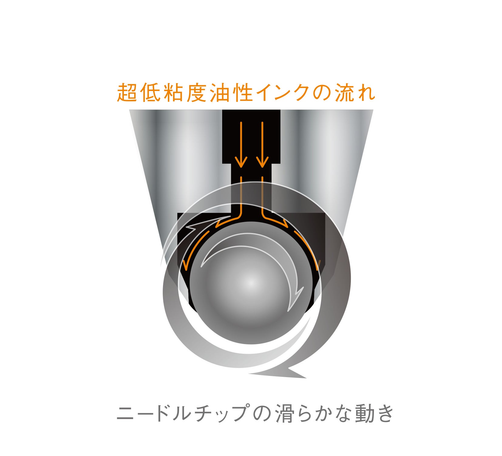 インクは、さらさらでなめらかな書き心地の超低粘潤滑油性インクを採用しました。新設計スプリングレスチップと組み合わせることで業界標準を超える滑らかさを実現しました。また、筆記時に紙面へ付着するインクのボテは、当社従来品比で約1/2に低減、一般的な低粘油性ボールペンに比べて約1/3程度に抑えられました(0.5㎜の場合/当社調査)。
