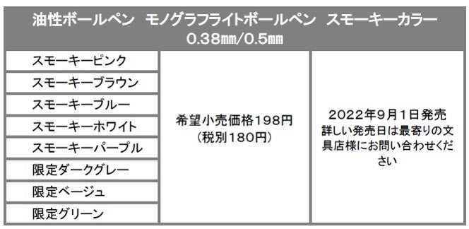 スモーキーカラー各色のボール径は0.38㎜と0.5㎜の2種、インク色は黒です。 希望小売価格は198円(税別180円)。