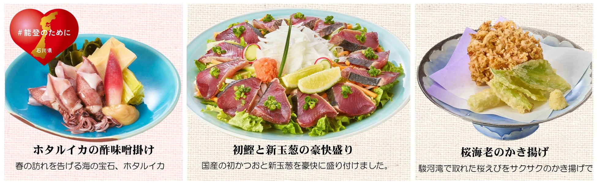 木曽路全店の店内飲食にて「ホタルイカの酢味噌掛け」税込880円を1食お召し上がりいただく毎に100円を能登半島沖地震の復興支援として寄付させていただきます。