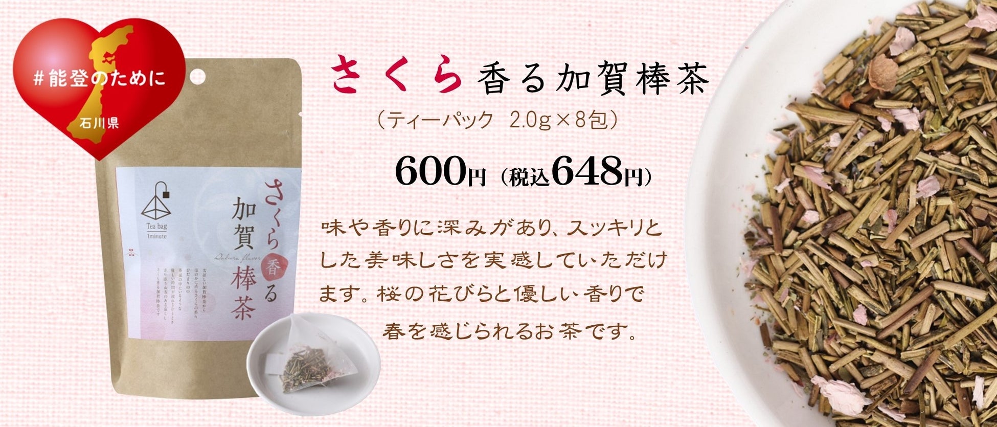 また店内で販売しているお土産商品の内、「さくら香る加賀棒茶」税込648円を1つご購入につき、100円を同じく能登半島沖地震への復興支援として寄付させていただきます。