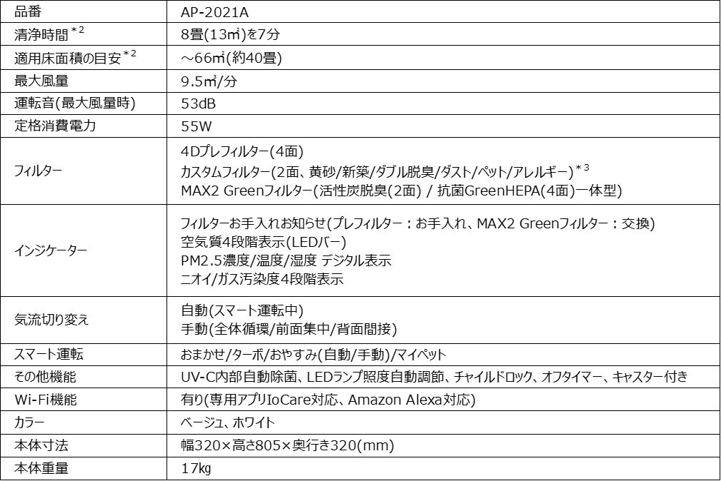 *1 グッドデザイン賞(Good Design Award、日本)、iFデザイン賞(iF Design Award、ドイツ)、レッドドットデザイン賞(Red Dot Design Award、ドイツ)、IDEA賞(Internal Design Excellence Awards、米国)。 *2 日本電機工業会規格(JEM1467)に基づいて算出。 *3 カスタムフィルターは別売品です。カスタムフィルターを取り付けなくても製品の動作、基本性能に影響はありません。*4 【試験機関】韓国建設生活環境試験研究院 【試験方法】韓国空気清浄協会規格(SPS-KACA 002-132:2018)の試験環境下で粒径0.01μmの塩化カリウム粒子を浮遊させ、最大風量で1時間運転させた後の除去率を評価。 *5 <浮遊ウイルス>【試験機関】中国家庭用電子機器研究院【試験対象】Escherichia virus Phi-X174, Influenza A virus (H1N1) 【試験方法】GB 21551.3:2010 6.の試験環境下で最大風量で1時間運転させた後の減少率を評価。<浮遊細菌> 【試験機関(A)】韓国建設生活試験研究院 【試験対象】大腸菌、黄色ブドウ球菌、肺炎桿菌、緑膿菌、メタシリン耐性黄色ブドウ球菌 【試験方法】ISO 16000-36:2018の試験環境下で最大風量で1時間運転させた後の減少率を評価。 【試験機関(B)】中国家庭用電子機器研究院 【試験対象】白色ブドウ球菌 【試験方法】GB/T 18801:2015 6. の試験環境下で最大風量で1時間運転させた後の減少率を評価。 *6 <ウイルス>【試験機関(A)】(一財)日本食品分析センター【試験対象】インフルエンザA型(H1N1)ウイルス 【試験方法】1種類のウイルスを滴下した試験片でウイルス感染価を測定。 【試験結果】24時間後検出せず。 【試験機関(B)】高麗大学(韓国) 【試験対象】マーズコロナウイルス 【試験方法】ウイルスを滴下した試験片でウイルス不活化効果を確認。 【試験結果】1時間後にウイルス感染の抑制率99.99%を確認。 <細菌>【試験機関(A)】(一財)日本食品分析センター 【試験対象】黄色ブドウ球菌 【試験方法】JIS Z 2801を参考にして菌液を接種した試験片で菌減少数を測定。 【試験結果】24時間後検出せず。 【試験機関(B)】財団法人FITI試験研究院(韓国) 【試験対象】大腸菌 【試験方法】KS K 0693に基づいて試験片に菌液を注入し菌減少数を測定。 【試験結果】18時間で99.9%減少。 <カビ菌>【試験機関】財団法人FITI試験研究(韓国) 【試験対象】クロコウジカビ 【試験方法】AATCC 30に基づいて試験片に菌を注入・培養しカビ抵抗性を確認。 【試験結果】2週間増殖が観察されず。 *7 日本電機工業会規格(JEM1467)に定められた試験方法による初期の除去効率。*8 汚染源粒子の挙動のCFD(Computation Fluid Dynamics)解析の結果。 【検証機関】延世大学(韓国) Energy, Fluids and Turbomachinery Lab. 【使用ソフトウェア】ANSYS CFX 17 【解析方法】非線形偏微分方程式(Navier-Stokes Equations)を適用し、多層流動解析法によって床上粒子の条件を設定。7.7m×7.7m×2.4mの室内空間の中央にNOBLE空気清浄機を設置し、密度0.0013g/㎤及び直径10㎛の汚染源に対する全体循環モードとマイペットモードの除去性能を比較。 *9 【試験機関】Intertek 【試験ガス】硫化水素(H2S) 【試験規格】温度20±10 ℃、湿度45±40 %、チェンバー面積8㎥ 【試験方法】基本フィルター(4D MAX2 Greenフィルター)とカスタムペットフィルター2枚(向かい2面)を装着したNOBLE空気清浄機を最大風量で30分間運転させ、硫化水素の除去率を測定 *10 :2006年~2021年。 *11:2003年~2021年。 *12:2018年~2021年。
