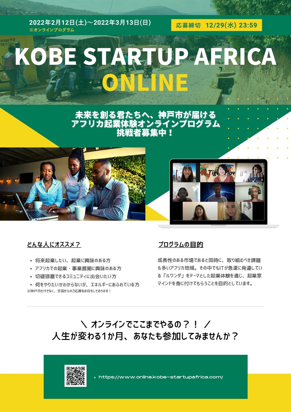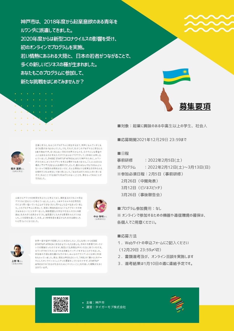 教育系スタートアップのタイガーモブ株式会社(本社:東京都荒川区、代表取締役:菊地恵理子 読み:きくち・えりこ、以下当社)は、この度、兵庫県神戸市(市長:久元喜造 読み:ひさもと・きぞう、以下神戸市)が主催する「神戸でチャレンジしたい若者」を育成することを目的としたルワンダ起業体験プログラム「 KOBE STARTUP AFRICA ONLINE 」の運営に全面協力します。
