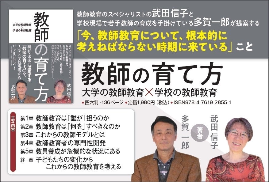 そこで本書では大学という出口(武田先生の立場)、学校という入り口(多賀先生の立場)の両方から、教師教育は誰が何をすべきなのか、新しい教師・教育モデルの提案、教師教育者の教育、教員養成の在り方、これからの教師教育について、本音で語り合います。