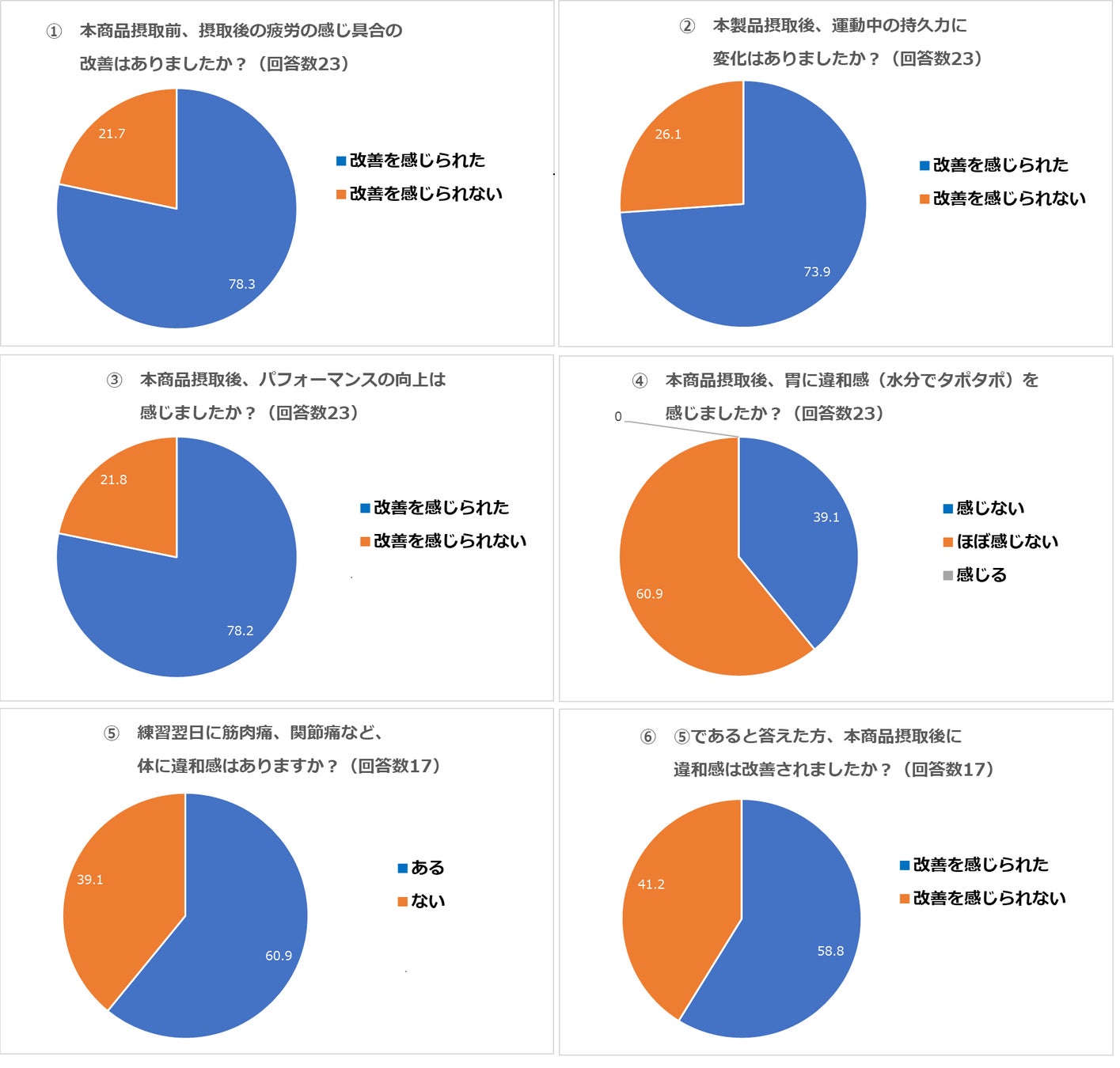 応援企画に参加いただいた部員の皆様(23名)に、摂取した事による体感についてアンケートも実施いたしました。その結果、疲労の改善やパフォーマンスの向上を体感したというご意見を多数いただきました。