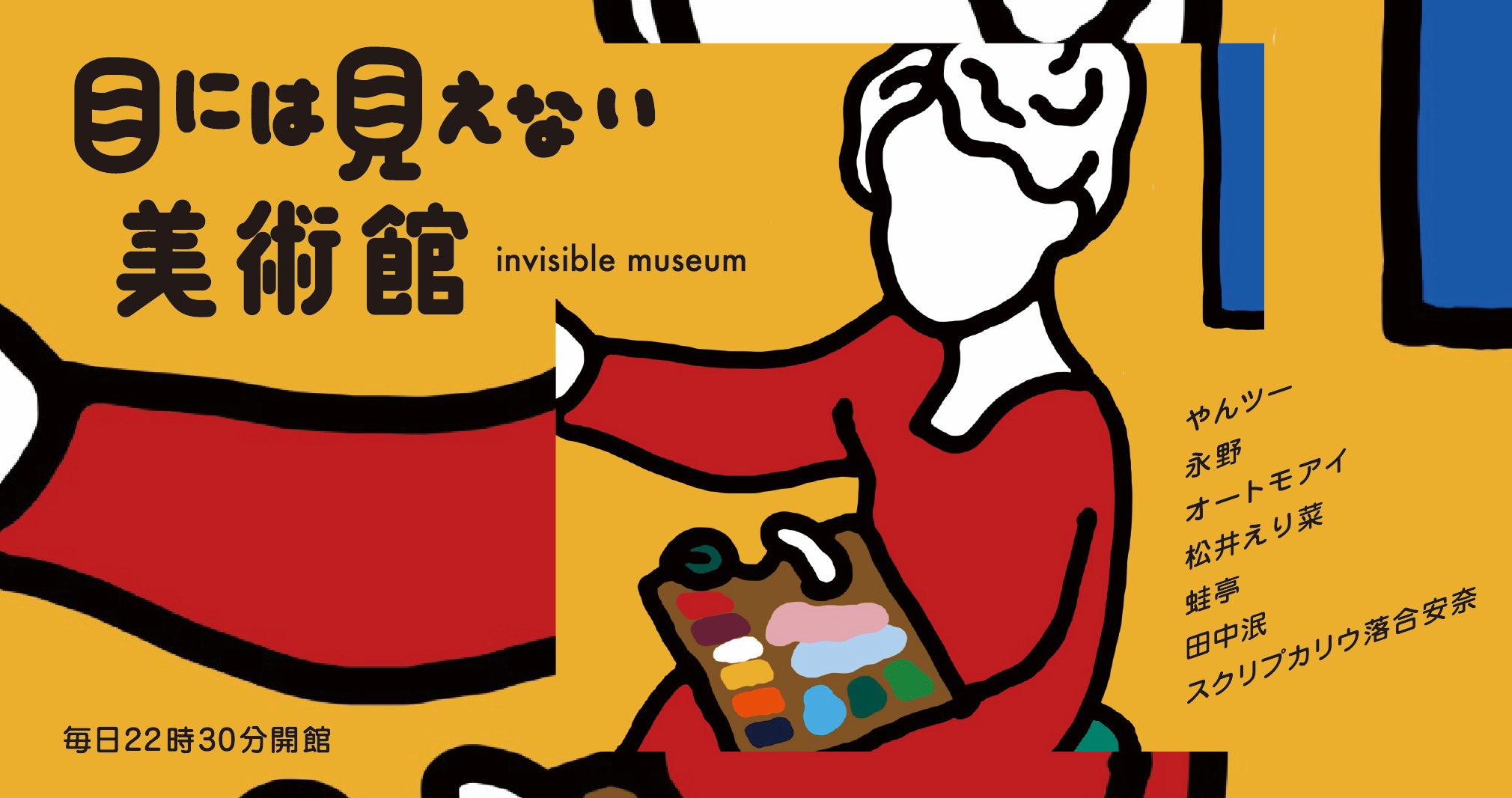 月曜館長にはデジタルテクノロジーを用いた作品を通じて”人間を必要としない芸術は可能か?”を問う美術家『やんツー』、火曜館長には斎藤工、金子ノブアキ、SWAY、清水康彦らが集う映像クリエイティブ集団“チーム万力”に所属する孤高のカルト芸人『永野』、水曜館長は「シュプリーム(Supreme)」や「ニューエラ(NEW ERA)」が注目する、匿名をテーマに顔のないヒトを描き続ける『オートモアイ』 、木曜館長は絵画における自画像をコミュニケーションツールとして用いながら、自画像表現の可能性を模索し続けてきた作家『松井えり菜』、金曜館長にはキングオブコント2021決勝にて「人工生命体がイワクラを母親と認識しイワクラはそれを拒否するも母性を芽生えさせる」というコントを披露し大きな話題を呼んだ芸人『蛙亭』、土曜館長は即興による“場踊り”で世界を魅了するダンサーであり、映画「たそがれ清兵衛」や大河ドラマ「鎌倉殿の13人」など近年では数多くの映像作品で圧巻の演技を見せる『田中泯』、そして日曜館長には“土地と人との結びつき”をテーマに差別や偏見といった目に見えない社会課題を可視化する現代美術家『スクリプカリウ落合安奈』の合計7組のアーティストがそれぞれの”目には見えない美術館”の館長として就任し3/7(月)から順次開館いたします。