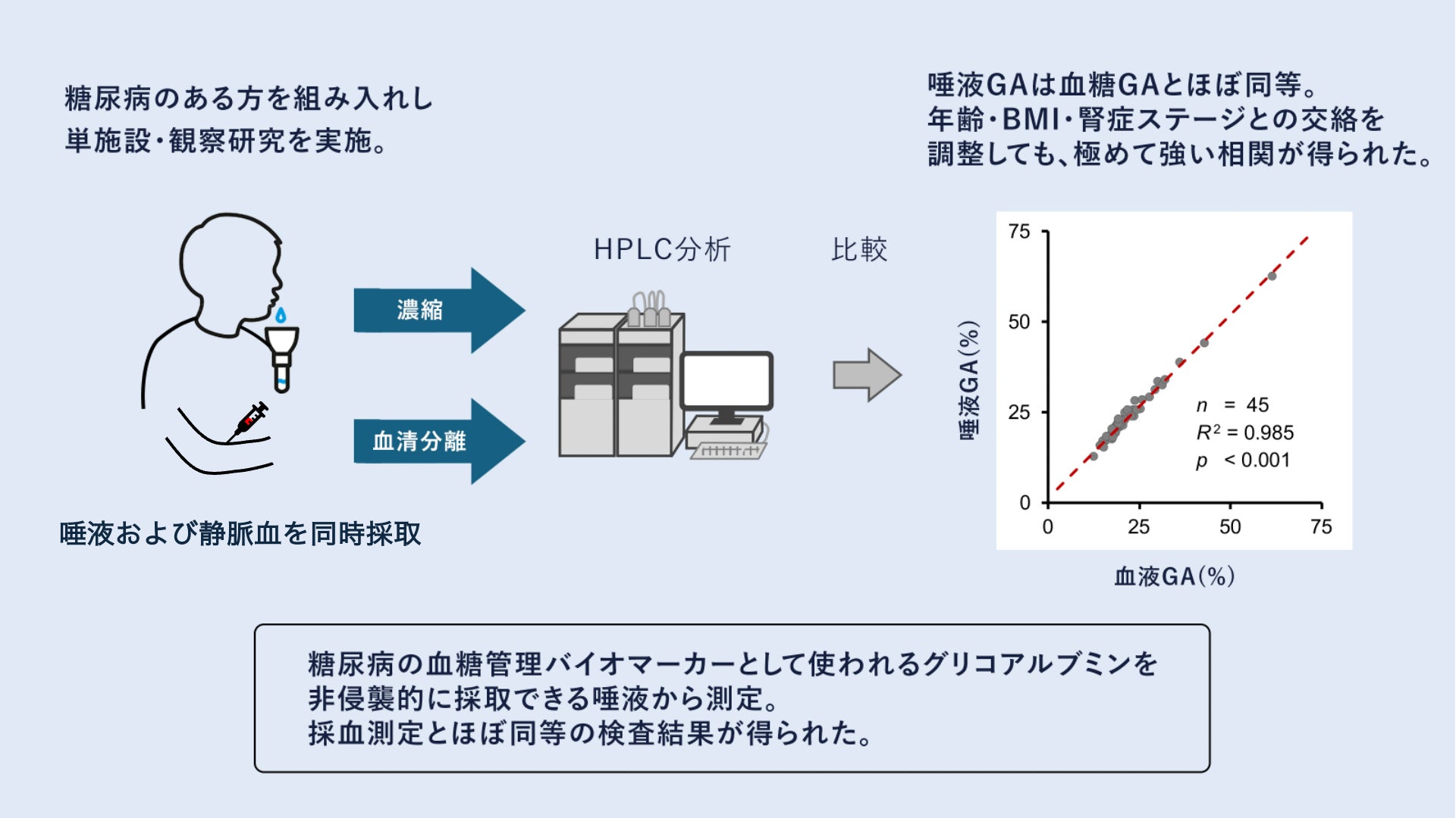 測定した唾液GA値は、従来の血液GA値と高い相関を示したことから、今後針刺し不要かつ信頼性の高い糖尿病管理指標としての活用が期待されます。