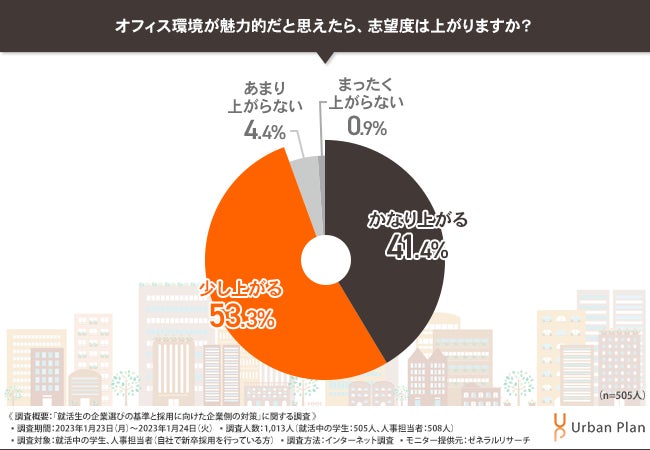 「オフィス環境が魅力的だと思えたら、志望度は上がりますか?」と質問したところ、9割以上の方が『かなり上る(41.4%)』『少し上る(53.3%)』と回答しました。