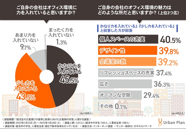 今回、「就活生の企業選びの基準と採用に向けた企業側の対策」に関する調査を実施した株式会社アーバンプラン(https://urban-plan.com/)は、これまで当社が培ってきたオフィス環境のノウハウをもとに、オフィスの適正面積を算出するサービス『ピタッとオフィス』を提供しております。