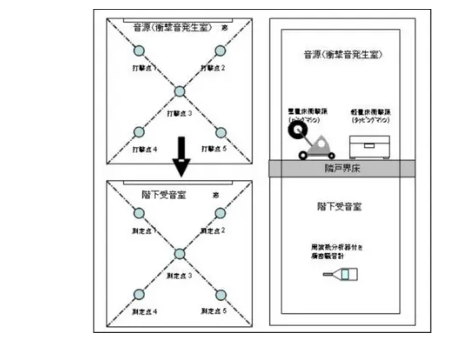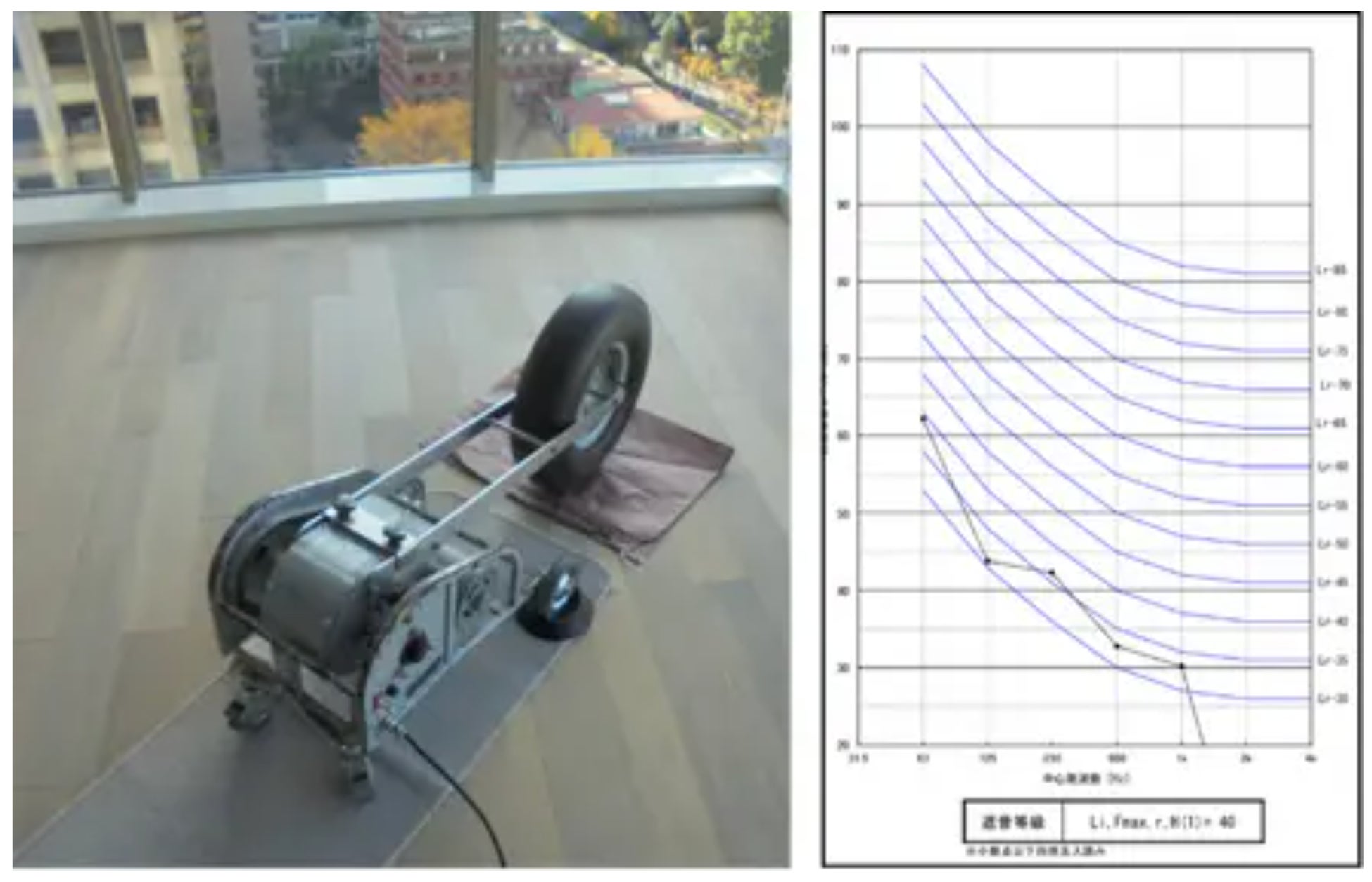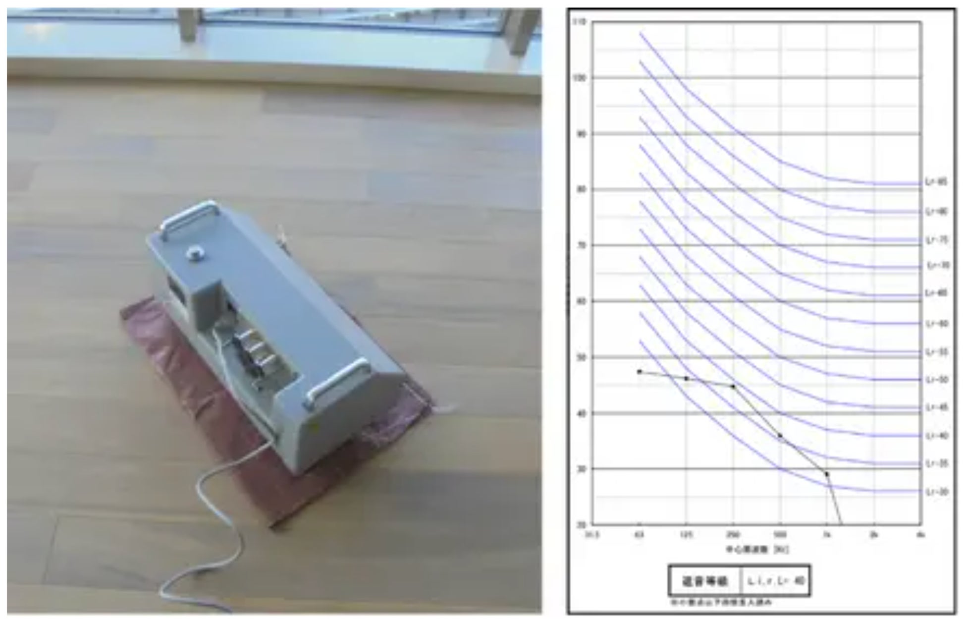 床への衝撃はタッピングマシンというハイヒール音のような軽量衝撃音を発生する装置と、バングマシンまたはインパクトボールという子供の飛び跳ね音のような重量衝撃音を発生する装置を用いて、上階の床に衝撃を加えた際に下階で発生する音を評価します。