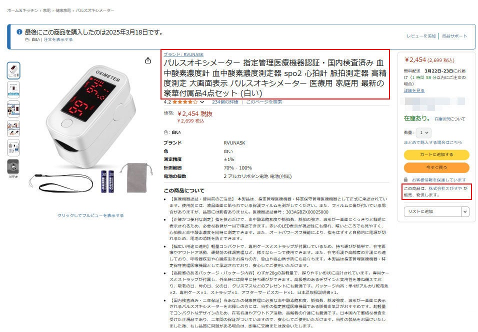 又、株式会社えびすやが販売していたパルスオキシメーターは商品ページ及び商品名