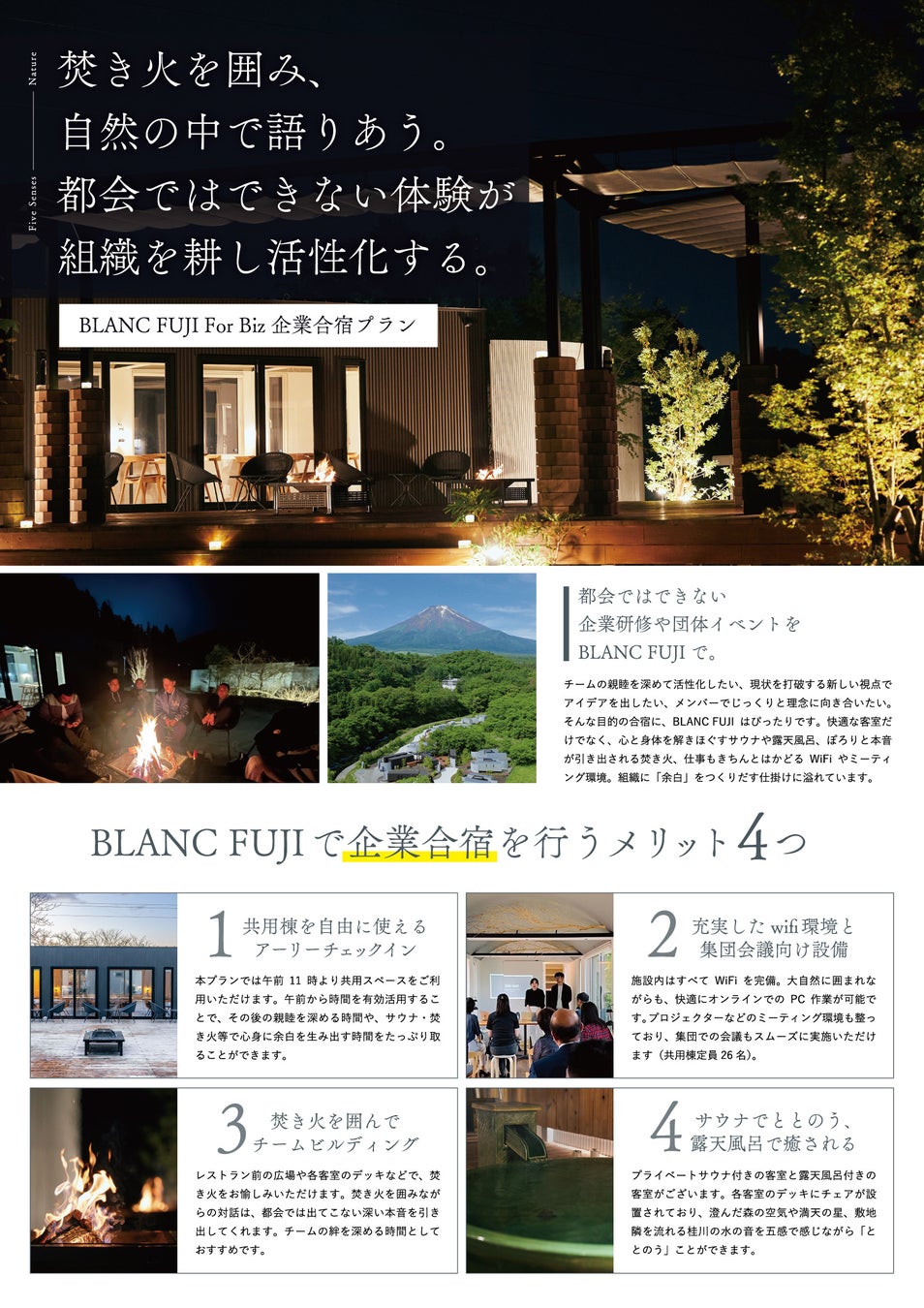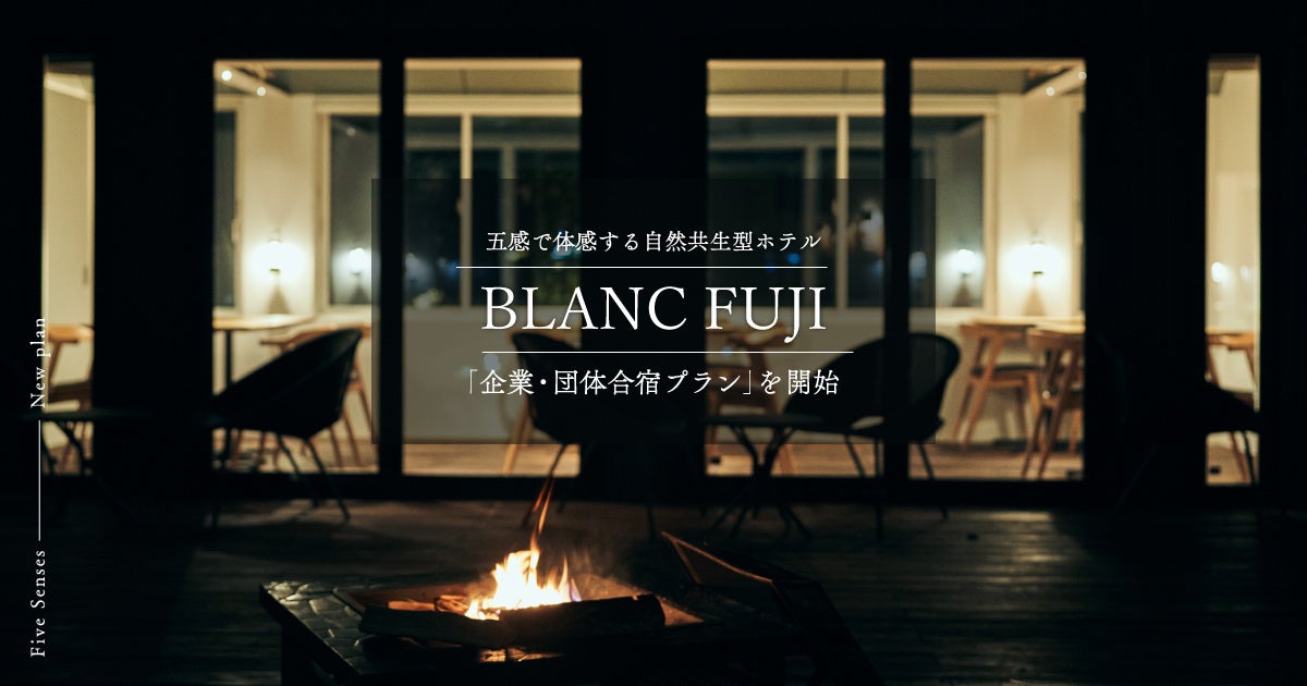 自然共生型ホテルをプロデュース・運営する株式会社BLANC(本社所在地:東京都港区、代表取締役:山中 拓也、以下当社)はBLANC FUJI(山梨県富士吉田市)にて企業・団体合宿プランの提供を開始します。38名までの団体様がご利用可能で、高速WiFiなどのインターネット環境のご用意はもちろん、サウナ・露天風呂・焚き火など、心と身体を解きほぐす仕掛けによって企業や組織の活性化をお手伝いします。