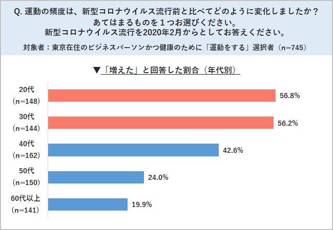また、新型コロナウイルス流行前と比べた運動頻度の変化を問うと、「増えた(40.0%)」「変わらない(43.2%)」「減った(16.8%)」という内訳になりました。「変わらない」が最多で、コロナウイルス流行に関係なく継続的に運動している層が多いことが分かります。「増えた」という層も同等程度確認されました。年代別に見ると、20代(n=148)が56.8%、次点で30代(n=144)が56.2%となり、若年層は意識的に運動頻度を増やしていると考えられます。
