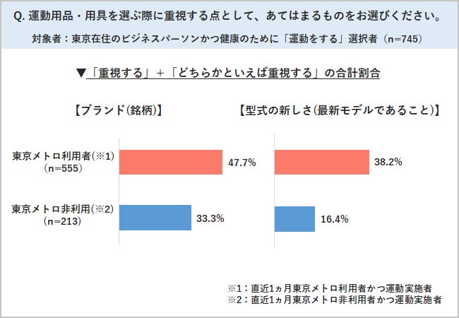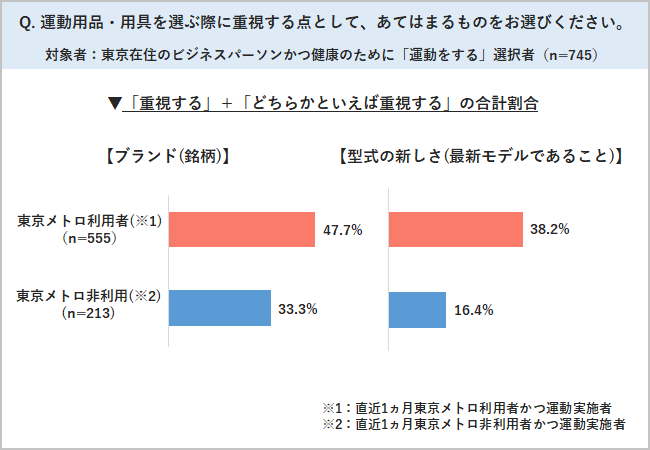 一方、相対的にスコアは低かったものの「ブランド(銘柄)」「型式の新しさ(最新モデルであること)」について、直近1ヵ月の東京メトロ利用有無で差が見られました。「ブランド(銘柄)」は、東京メトロ利用者(n=550)では47.7%、東京メトロ非利用者(n=195)では33.3%。「型式の新しさ(最新モデルであること)」は、東京メトロ利用者(n=550)では38.2%、東京メトロ非利用者(n=195)では 16.4%となり、いずれも東京メトロ利用者の方が高いスコアを示しました。以上の結果を踏まえると、スポーツブランドの新商品を出した際に東京メトロ利用者にコミュニケーションするのは有効と言えそうです!