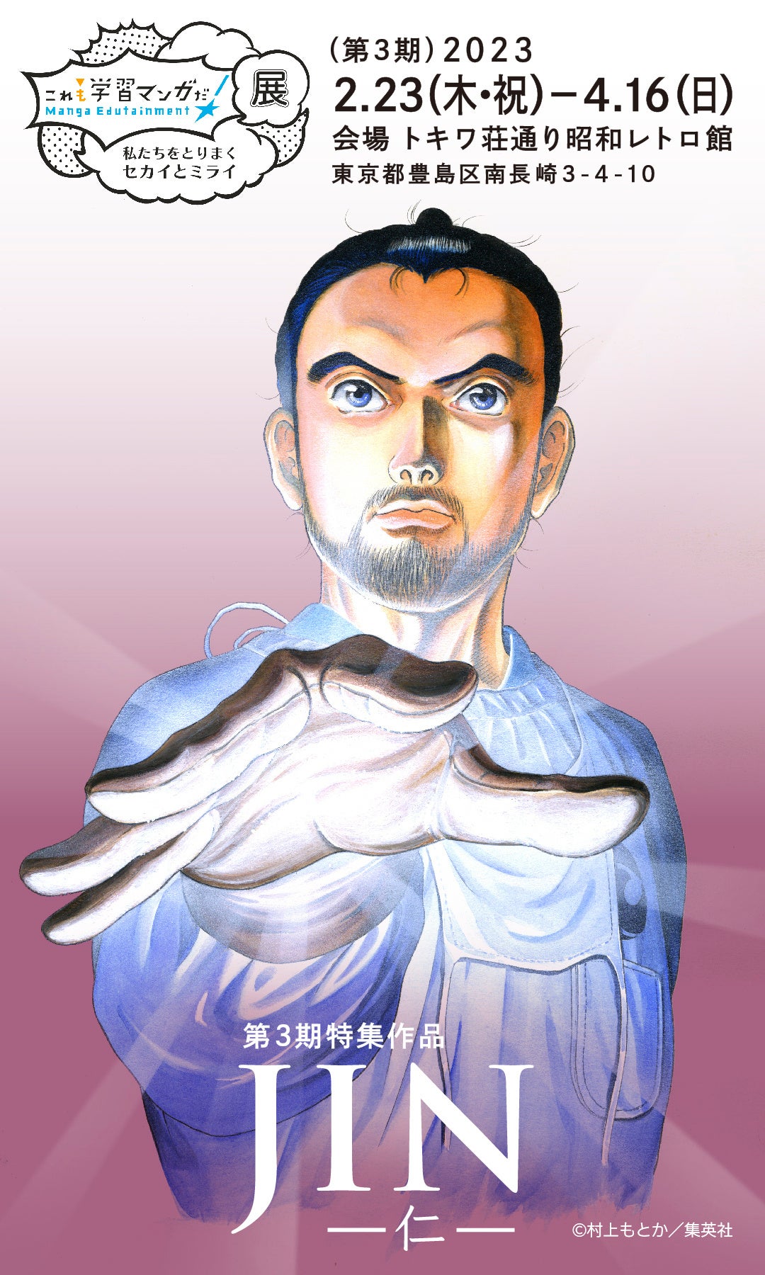「トキワ荘通り昭和レトロ館(豊島区立昭和歴史文化記念館)」で開催中の「これも学習マンガだ!展〜私たちをとりまくセカイとミライ〜」の第3期特集作品が『JIN―仁―』(村上もとか/集英社)に決定しました。第3期特集の展示期間は2023年2月23日(木・祝)〜4月16日(日)となります。