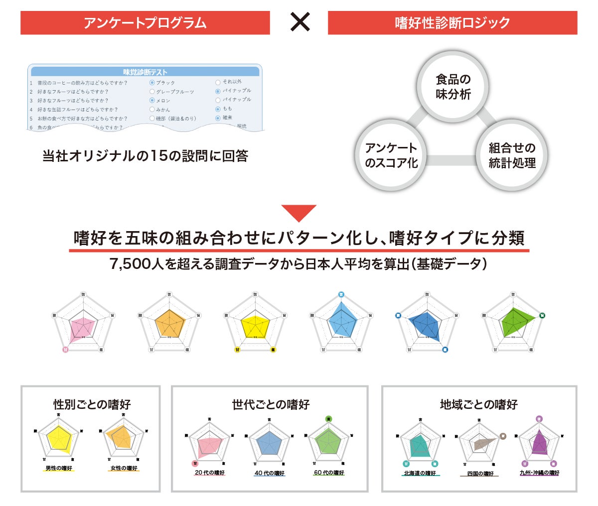 味香り戦略研究所が保有する12万アイテム超の食品の味データベースを基に開発したアンケートプログラムと嗜好性診断ロジックによって、個人の好み・嗜好(=おいしさ)を科学的に明らかにする独自の診断技術です。7,500人を超える調査データから日本人平均を算出し、これを基礎データとして大分類6、細分類22の嗜好性パターンを見出しました。現在、アンケートデータは40,000人を超える調査データ群となっています。アンケートに回答することで、嗜好を五味の組み合わせにパターン化し、診断します。特許第7448274号。