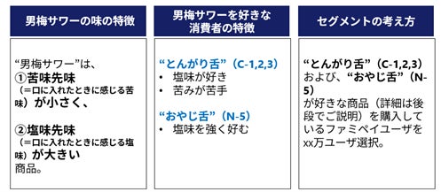 ①「サッポロ 男梅サワー」を対象に、味覚データの取得、嗜好性データとの突き合わせ、フードペアリング解析を行い、味の特徴から購買者セグメントを抽出できました。