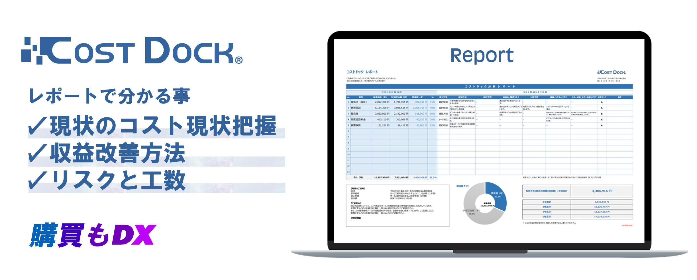 コスト分析できるのは間接費約40項目でサプライヤ切替えをしてもサービスの質が担保できるためその項目に絞っております。今使っている請求データをもらえればその価格と、コストドックの最安値の購買価格が下記のコストドックレポート(以下「レポート」)にて比較ができます。