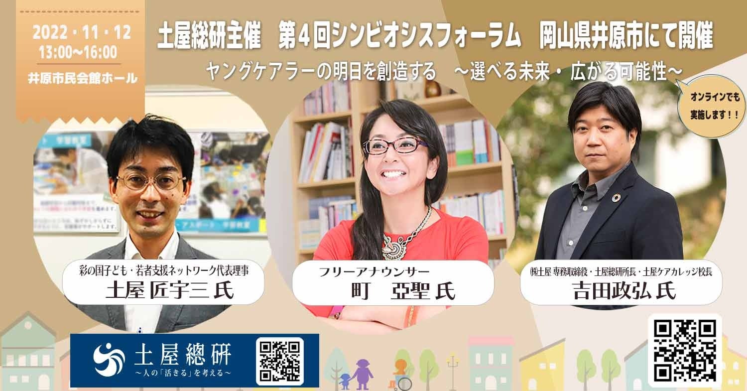 重度障害をお持ちの方(以下、重度障害者)の在宅支援事業を行う株式会社土屋(本拠地:岡山県井原市)は、ヤングケアラー問題の解消に向けた講演会を11月12日(土)、岡山県井原市で開催いたします。当日はフリーアナウンサーで元ヤングケアラーの町亞聖氏や元宮城県知事の浅野史郎氏、彩の国子ども・若者支援ネットワークの理事、土屋匠宇三氏などが登壇します。