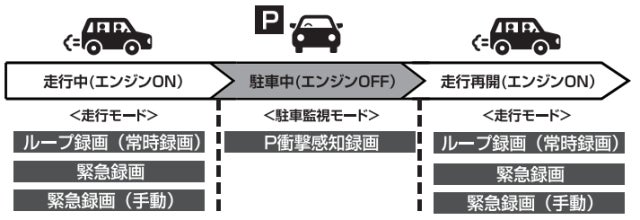 前後だけでなく、横方向の映像も記録でき、事故の際はもちろん駐車時の当て逃げや通称ドアパンチもしっかりと記録することができます。