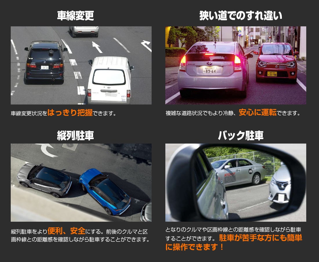 ドライバーの視点からは、ピラー(柱)の陰になる部分や前後左右のウインドウの下側など、どうしても見ることのできない死角が存在します。これらの死角を極力減らすことは【AKY-Z3GT PRO】のねらいです。