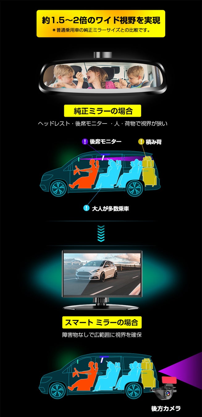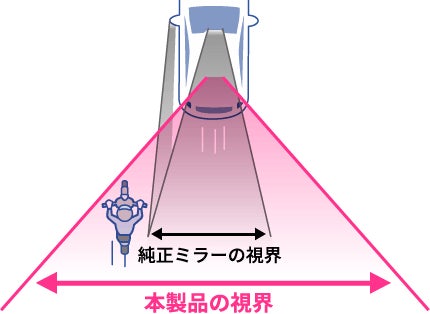 バックミラー型の大画面に後方の映像をリアルタイムで投影できるので、明朗な視界が確保できます。