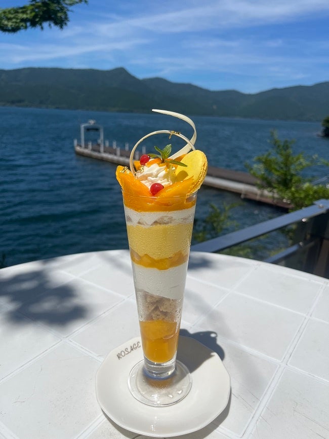 “小田急 山のホテル”直営のデザートレストラン“プレミアムショップ&サロン・ド・テ ロザージュ”では、芦ノ湖畔のテラス席で楽しむスイーツにふさわしい、マンゴーをメインとしたパフェを7月8日(金)より期間限定で販売しています。
