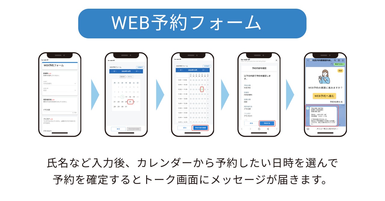 WEB予約フォームでは、患者さんの氏名などを入力後、カレンダーから予約日時を選択することで診察の予約を完了できます。予約完了後には、予約日時に関するメッセージを自動配信し、また診察予定日の前日にはリマインドメッセージを自動配信することで診察忘れを防ぎます。