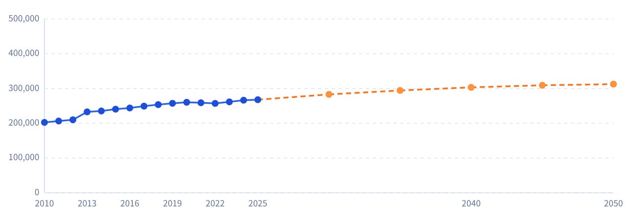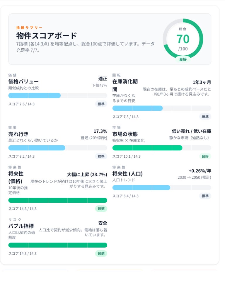 過去の価格トレンドから10年後の推定価格を計算。人口については、政府統計(e-Stat)と将来人口推計(IPSS)を統合し、物件の「実需」の将来性をスコア化します。