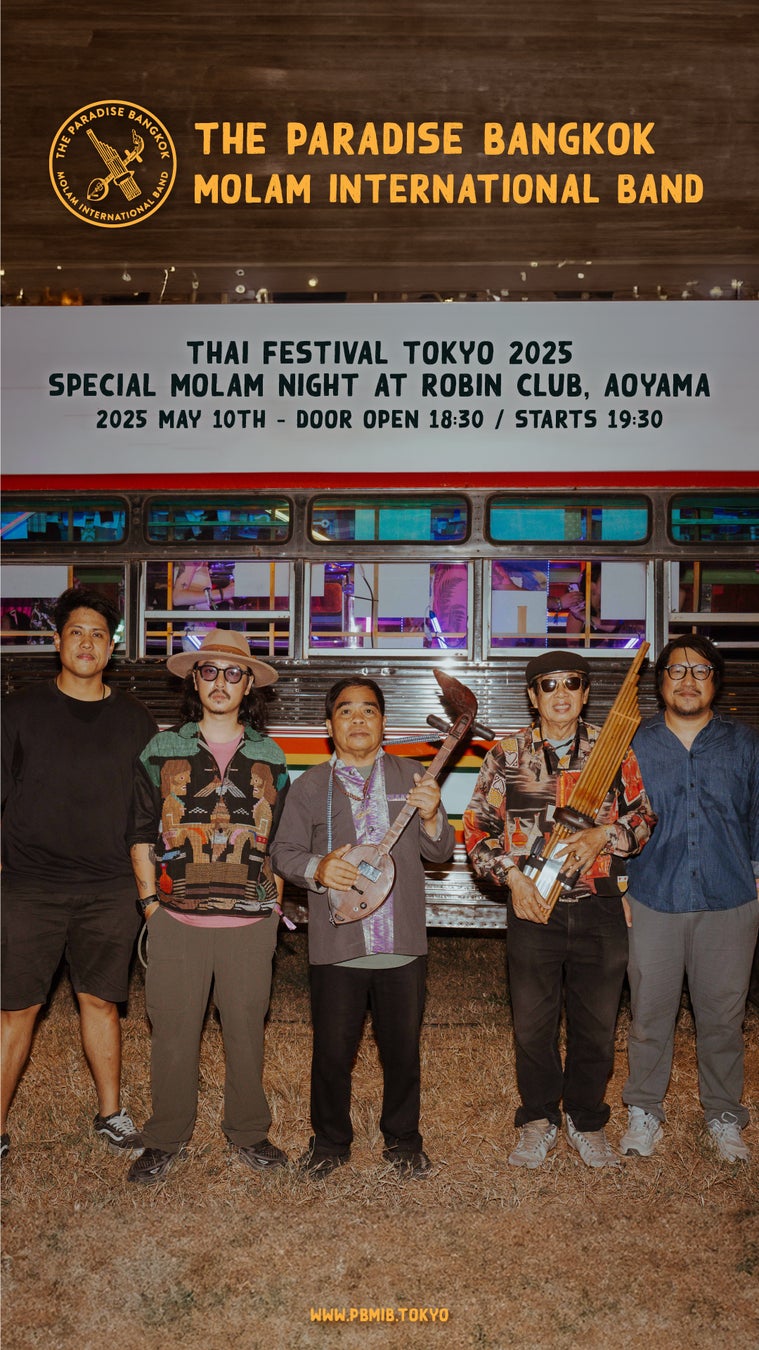 タイの伝統と革新が交差する唯一無二のサウンド!The Paradise Bangkok Molam International Band がついに来日決定! タイフェスティバル東京2025の有料イベント“Paradise Bangkok Molam International Band Special Molam night of -Thai Festival Tokyo 2025-” にて、世界中のフェスを熱狂させてきた彼らの圧巻のライブが、2025年5月10日(土)青山Robin Clubにて開催決定!2013年の結成以来、タイ東北部イサーン地方の伝統音楽「モーラム」に、ファンク、ロック、エレクトロニック、サイケデリックなどの現代的要素を融合し、音楽ファンの心を鷲掴みにしてきたThe Paradise Bangkok Molam International Band。これまでにグラストンベリー、フィールド・デイ、Boiler Room、そしてフジロックフェスティバルなど、世界中の主要フェスティバルに出演し、熱狂的な支持を集めてきた彼らのサウンドが、ついに渋谷を揺らす!DJ・音楽ディレクターのMaft Saiを中心に結成された本バンドは、地元バンコク「Studio Lam」での深夜のセッションからインスパイアされた、グルーヴ感溢れる生演奏で観客をトランス状態へと誘う。今回の日本公演は、アジアから世界へと広がる“新しい伝統音楽”の体験を、間近で体感できる貴重な一夜。世界の音楽シーンを揺るがす、タイ発の革命的サウンドを見逃すな!