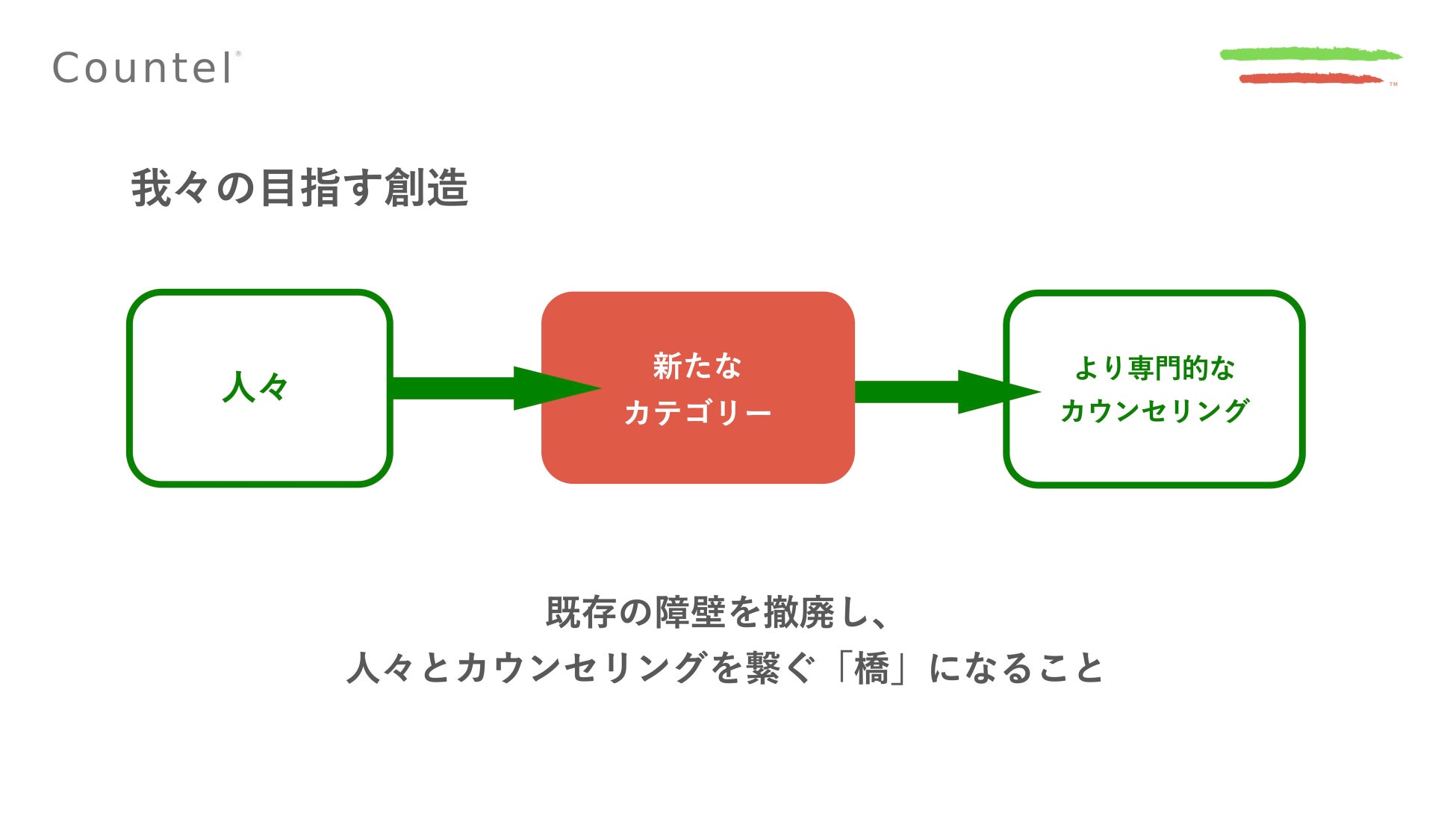Countel はカウンセリング業界において、これら4つの課題を乗り越えた極めて使いやすく、相談へのハードルを大幅に下げた「新たなカテゴリー」となる相談サービスを生み出し、人々がより専門的で本当に効果のある医療カウンセリング等への容易なアクセスを可能とする、「橋」となることを目指します。
