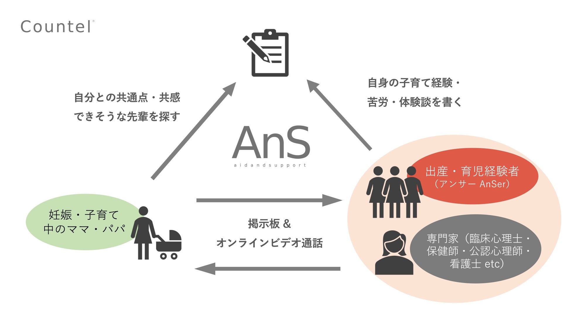 上記の4つの課題を乗り越えた、「産後うつ」予防のための育児層向け相談サービスが、『カウンテル アンス』(https://www.countel.net)です。『カウンテル アンス』は育児中のママ・パパが、同じような悩みや経験を持つ先輩ママ・パパや専門家(保健師や臨床心理士など)に、今すぐ相談できるスマホアプリです。