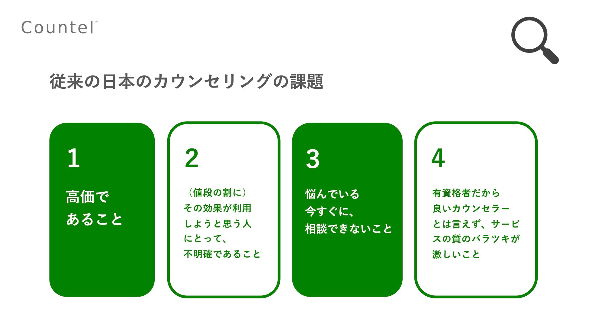 しかしながら現在の日本ではカウンセリングが広く一般的に普及しているとはとても言い難く、日常生活にカウンセリング文化が根付いている欧米の状況とはかけ離れていると言えます。その理由としては、主に以下の4つがあるとCountel は考えます。1つ目は「日本ではカウンセリングは保険適応外で、高価であること」、2つ目は「高価格の割に、その効果が利用しようと思う人にとって不明確であること」、3つ目は「事前の予約が必要なことが多く、悩んでいる今すぐに相談できないこと」、4つ目は「有資格者であることが、良いカウンセラーである保証には完全につながらず、同じカウンセリングでもサービスの質のバラツキが激しいこと」が挙げられます。