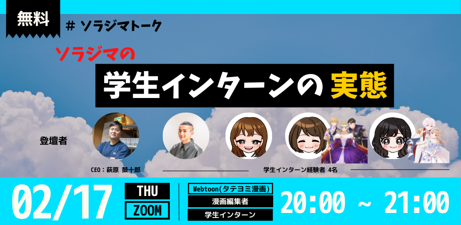 国内をはじめ海外も視野に入れたWebtoonの制作を行う「株式会社ソラジマ」が出版業界や漫画編集者を目指す学生向けに「漫画編集インターン生」についての無料ウェビナーを2月17日に開催致します。