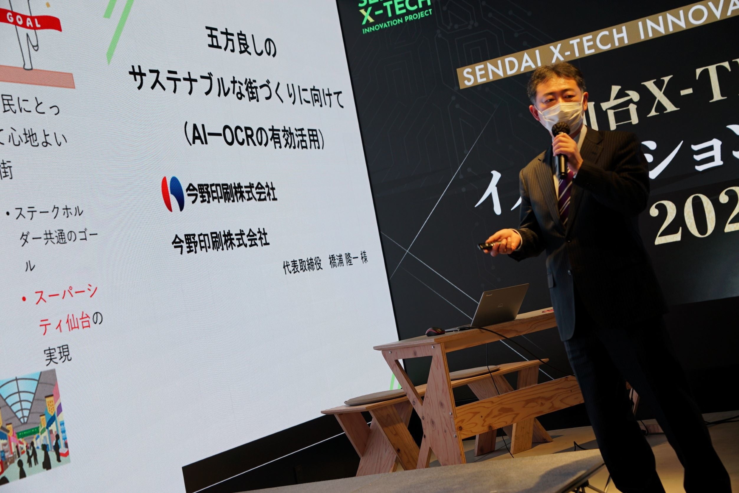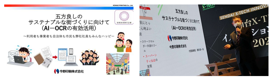創業100年以上の歴史を有し、仙台市を中心に印刷業を展開している今野印刷株式会社は、手書き帳票のデータ化を効率的に行うためAI-OCRの活用を進めてきました。読み取り精度に課題があったものの、「仙台 X-TECHイノベーションプロジェクト2021」の取り組みを通じて、業務プロセスの見直しを実施し、90%以上の精度を獲得。このAI-OCR活用により、地元商店街が有する顧客情報のデータ化、顧客データと人流情報を組み合わせた需要予測モデルの構築等、商店街の活性化を支援し、市民にとって心地よい街づくりを目指すビジネスプランを発表しました。