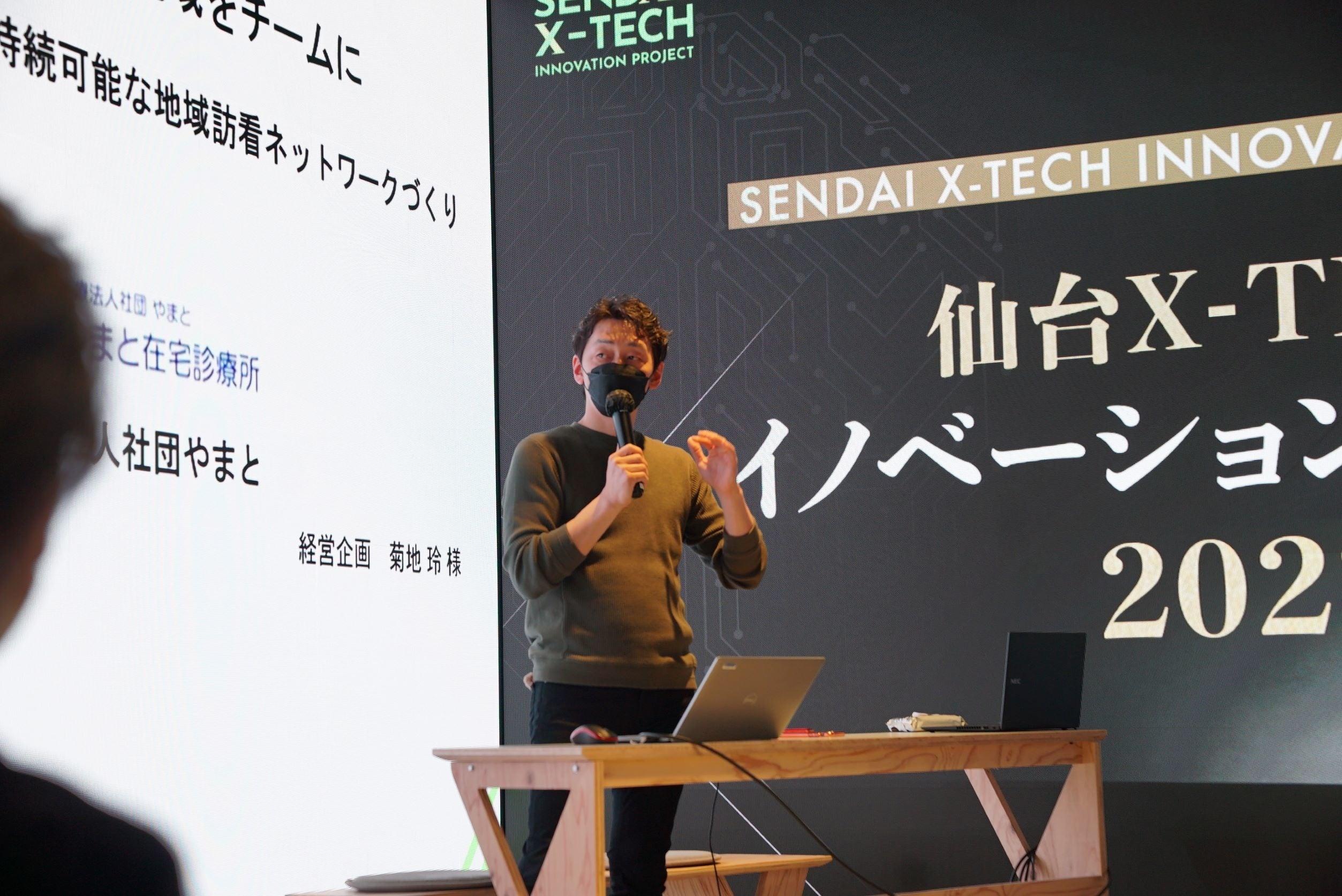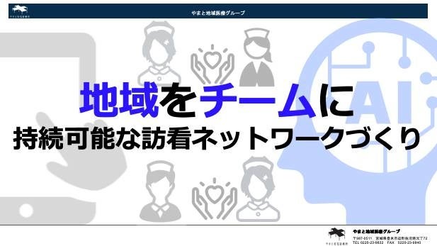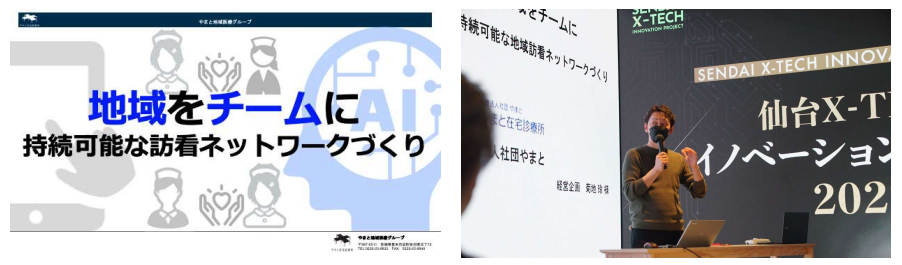 医療法人社団やまとは、宮城県登米市を中心に、在宅診療や訪問看護サービスを提供しています。昨今、少子高齢化が進行し、在宅医療の需要は増加傾向にある一方、地方の医療従事者は不足している状況です。業務の効率化と需要に応える人材の確保が喫緊の課題となっていることに対し、やまとでは、夜間休日の緊急出動を減らす、訪問の移動を減らす、人材を増やすという観点から課題にアプローチ。カルテ情報等のデータを活用した夜間休日の出動予測モデル構築による緊急出動の削減、地域内で患者宅に近い看護師を迅速に調整するシステム構築による移動距離・時間の削減、約70万人の潜在看護師を活用した訪問看護サービスによる人材を増やすアイデアを発表しました。