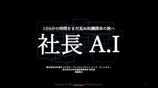 ソフトウェア開発・販売等の事業を展開する仙台市のIT企業SRA東北は、ビジネスマンの学習の効率化に着目した「社長A.I」を発表しました。チームマネジメント、販売戦略等、その時々でビジネスマンが抱えている悩みに対し、複数の名経営者が執筆した書籍を教師データとするAIが解決のヒントを提示する仕組みにより、効率的な学習を実現。そのほかにも、1,000の質問に答えることで自身のAIをつくり出すことが可能で、人材育成や知識の承継などさまざまなシーンでの活用が期待できる、と話しました。
